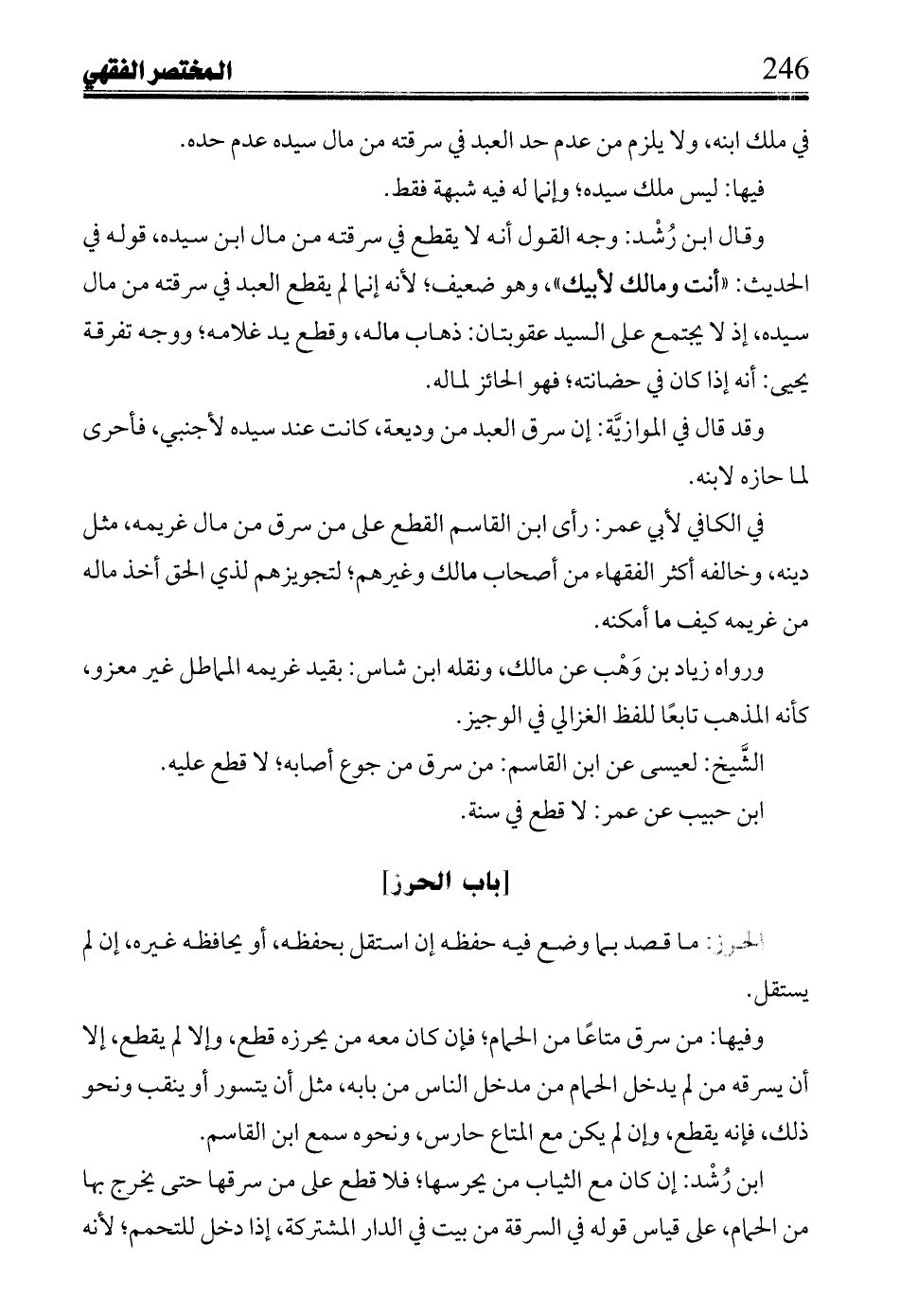 وقال ابن رشد: وجه القول أنه لا يقطع في سرقته من مال ابن سيده، قوله في الحديث (أنت ومالك لأبيك)، وهو ضعيف؛ لأنه إنما لم يقطع العبد في سرقته من مال سيده، إذا لا يجتمع على السيد عقوبتان: ذهاب ماله، وقطع يد غلامه؛ ووجه تفرقة يحيي: أنه إذا كان في حضانته؛ فهو الحائز لماله.