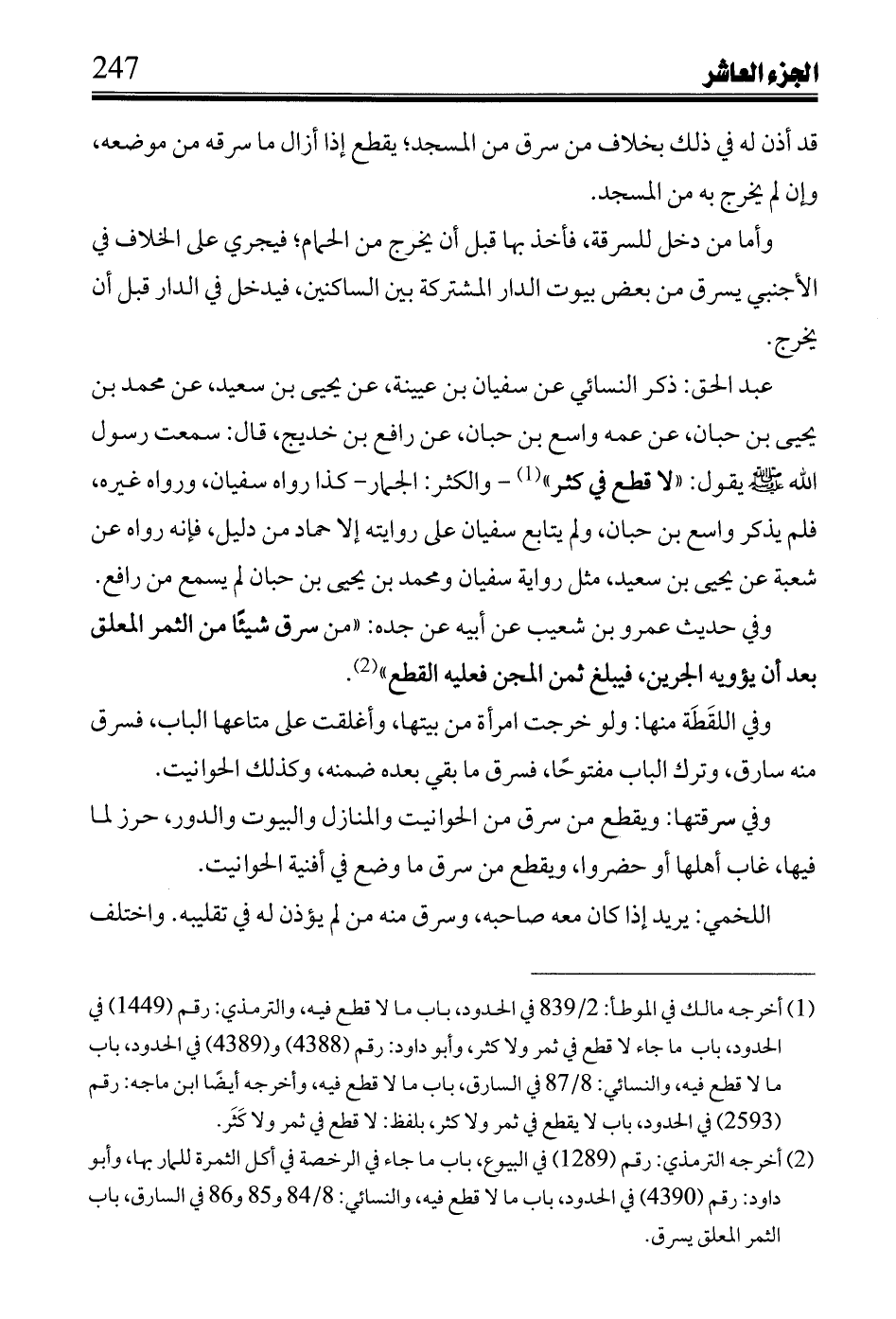 وفي حديث عمرو بن شعيب عن أبية عن جده: (من سرق شيئاً من الثمر المعلق بعد أن يؤويه الجرين، فيبلغ ثمن المجن فعليه القطع).