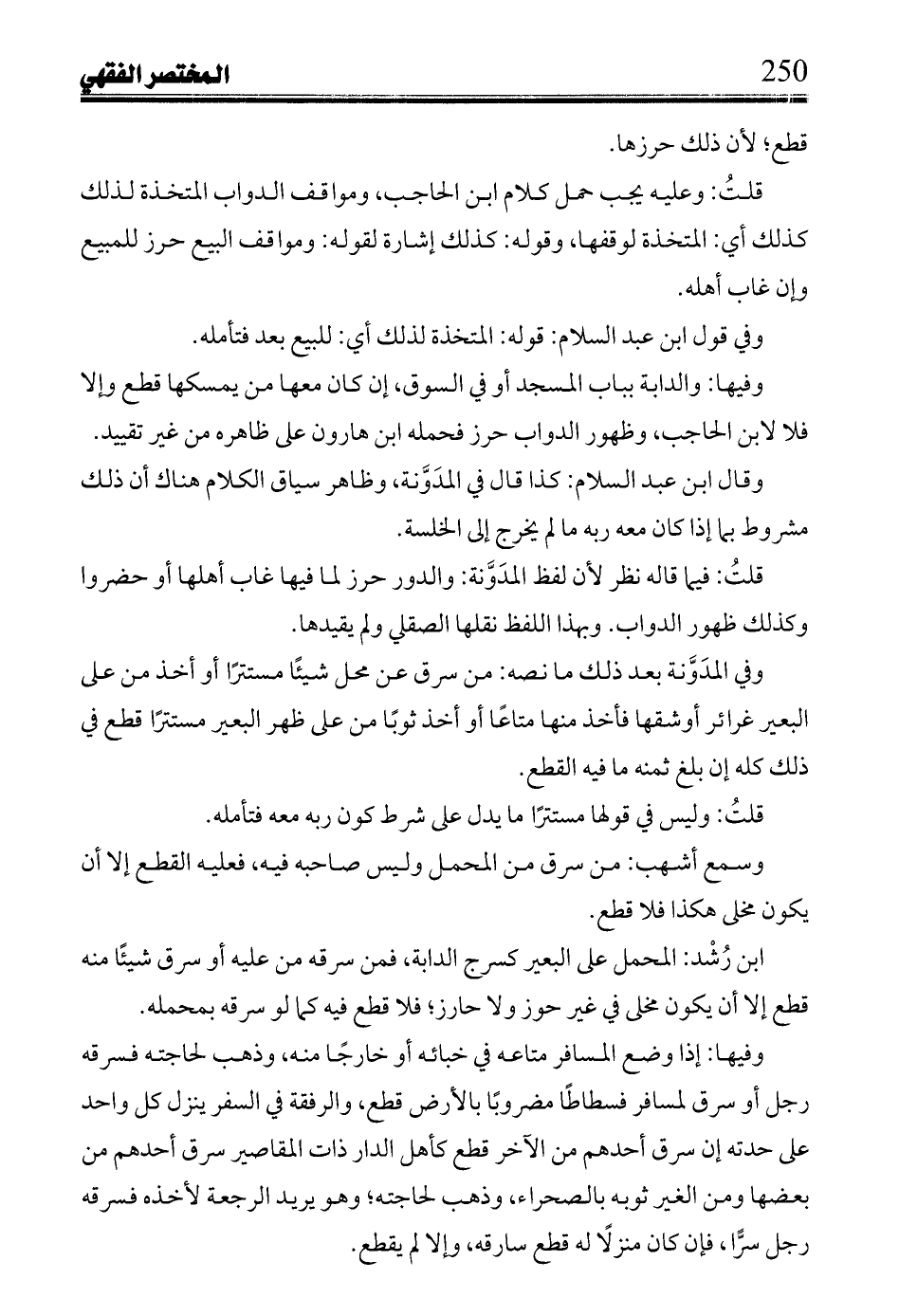 وفيها: والدابة بباب المسجد أو في السوق، إن كان معها من يمسكها قطع وإلا فلا لابن الحاجب، وظهور الدواب حرز فحمله ابن هارون على ظاهره من غير تقييد.