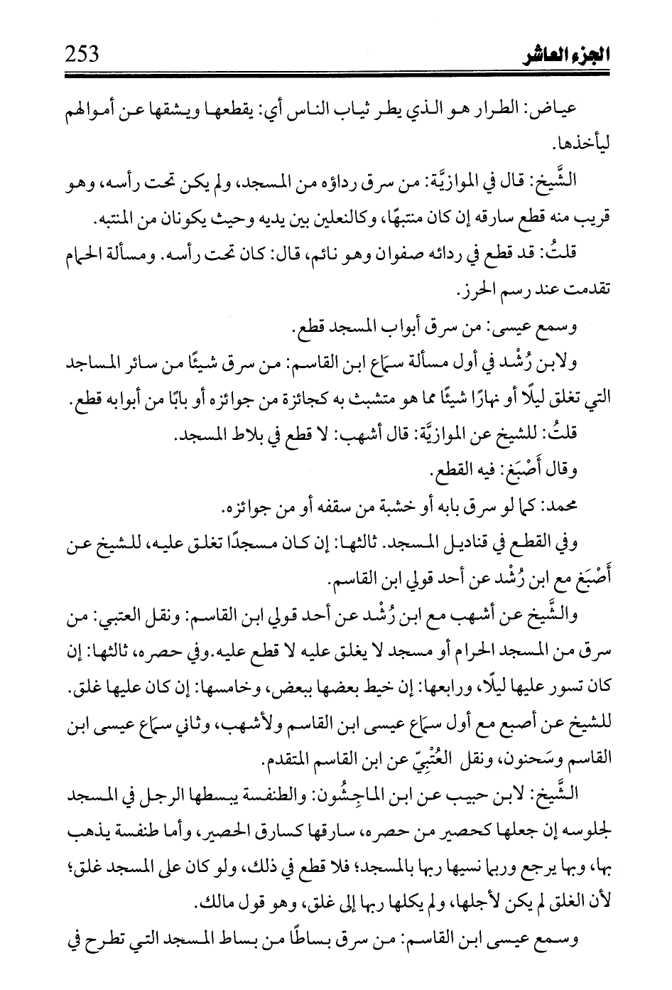 ولابن رشد في أول مسألة سماع ابن القاسم: من سرق شيئاً من سائر المساجد التي تغلق ليلاً أو نهاراً شيئاً مما هو متشبث به كجائزة من جوائزه أو باباً من أبوابه قطع.