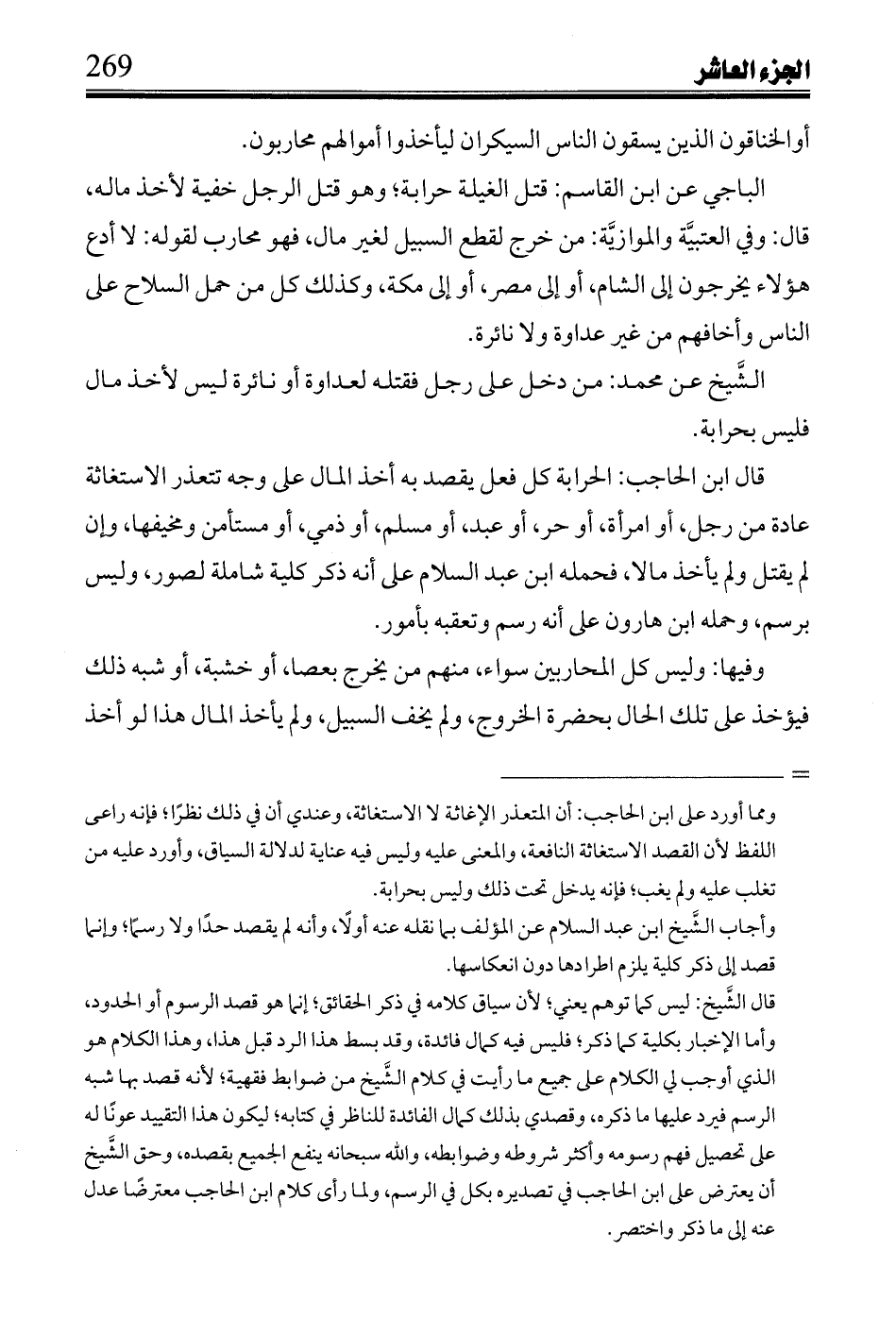 قال ابن الحاجب: الحرابة كل فعل يقصد به أخذ المال على وجه تتعذر الاستغاثة عادة من رجل، أو امرأة، أو حر، أو عبد، أو مسلم، أو ذمي، أو مستأمن ومخيفها، وإن لم يقتل ولم يأخذ مالا، فحمله ابن عبد السلام على أنه ذكر كلية شاملة لصور، وليس برسم، وحمله ابن هارون على أنه رسم وتعقبه بامور.