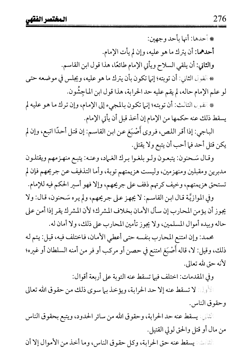 (القول الثالث: أن توبته؛ إنما تكون بالمجيء إلى الأمام، وإن ترك ما هو عليه لم يسقط ذلك عنه حكمها من الإمام إن أخذ قبل أن يأتي الإمام.