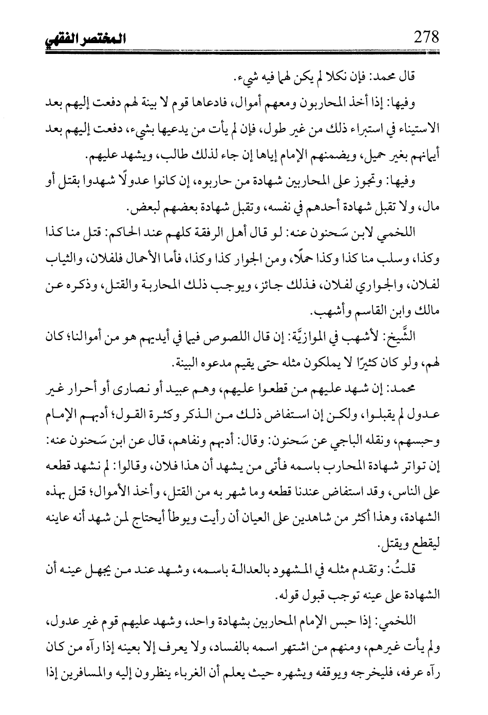محمد: إن شهد عليهم من قطعوا عليه، وهم عبيد أو نصارى أو أحرار غير عدول لم يقبلوا، ولكن إن استفاض ذلك من الذكر وكثرة القول؛ أدبهم الإمام وحبسهم، ونقله الباجي عن سَحنون: وقال: أدبهم ونفاهم، قال عن ابن سَحنون عنه: إن تواتر شهادة المحارب باسمه فأتى من يشهد أن هذا فلان، وقالوا: لم نشهد قطعه على الناس، وقد استفاض عندنا قطعه وما شهر به من القتل، وأخذ الأموال؛ قتل بهذه الشهادة، وهذا أكثر من شاهدين على العيان أن رأيت ويوطأ أيحتاج لمن شهد أنه عاينه ليقطع ويقتل.