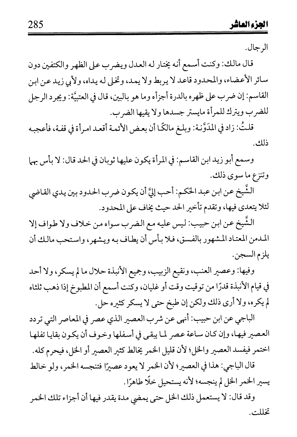 وفيها: وعصير العنب، ونقيع الزبيب، وجميع الأنبذة حلال ما لم يسكر، ولا أحد في قيام الأنبذة قدراً من توقيت وقت أو غليان، وكنت أسمع أن المطبوخ إذا ذهب ثلثاه لم يكره، ولا أرى ذلك ولكن إن طبخ حتى لا يسكر كثيره خل.