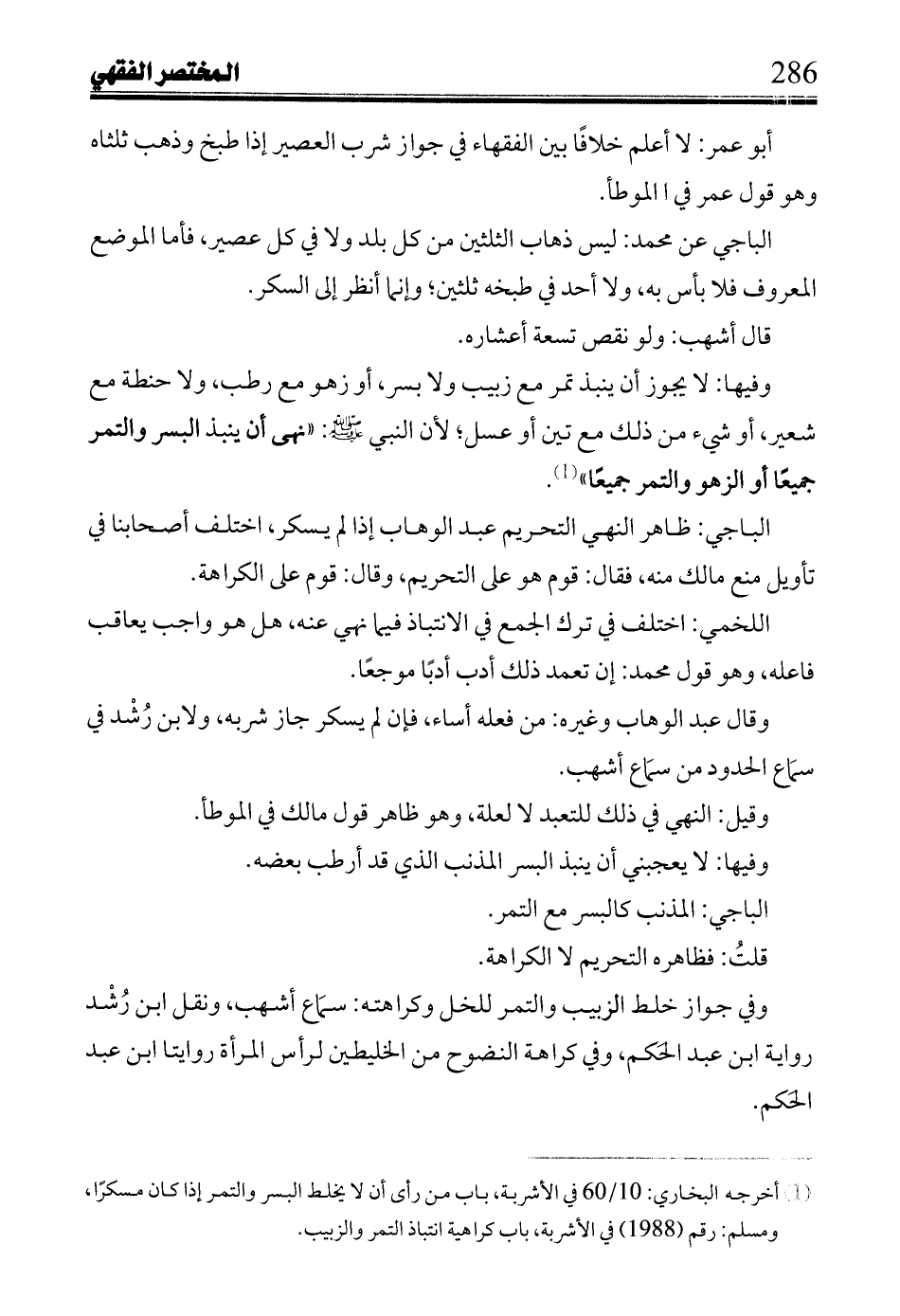 وفيها: لا يجوز أن ينبذ تمر مع زبيب ولا بسر، أو زهو مع رطب، ولا حنطة مع شعير، أو شيء من ذلك مع تين أو عسل؛ لأن النبي صلى الله عليه وسلم: «نهى أن ينبذ البسر والتمر جميعاً أو الزهو والتمر جميعاً».