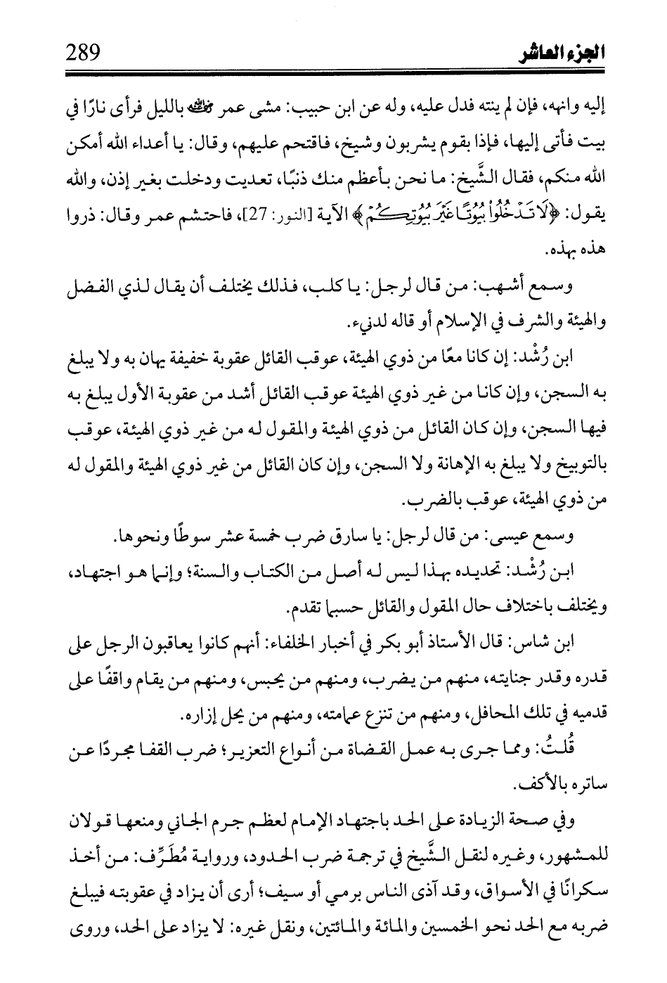 ابن شاس: قال الأستاذ أبو بكر في أخبار الخلفاء: أنهم كانوا يعاقبون الرجل على قدره وقدر جنايته، منهم من يضرب، ومنهم من يحبس، ومنهم من يقام واقفاً على قدميه في تلك المحافل، ومهم من تنزع عمامته، ومنهم من يحل إزاره.
