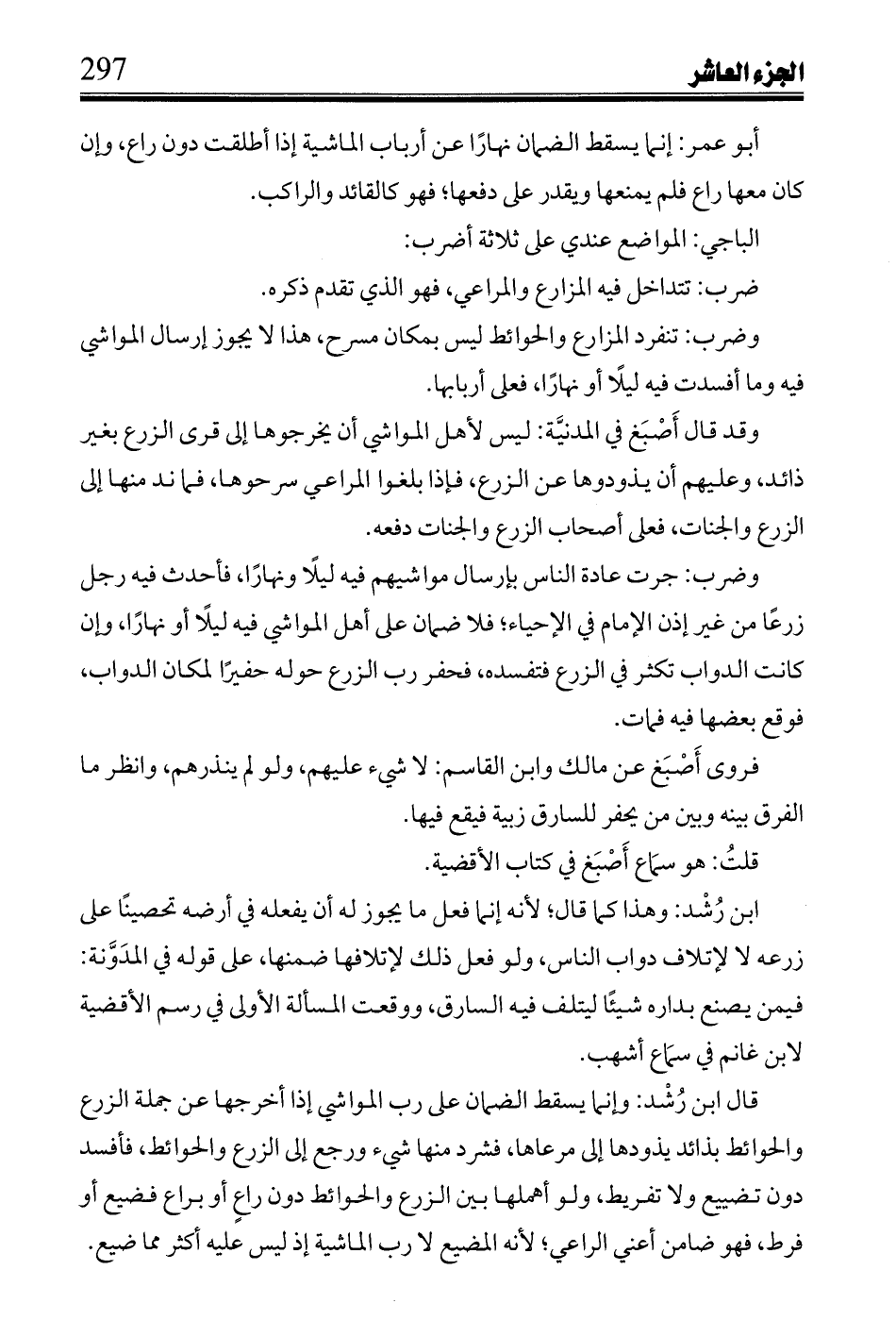 قال ابن رُشْد: وإنما يسقط الضمان على رب المواشي إذا أخرجها عن جملة الزرع والحوائط بذائد إلى مرعاها، فشرد منها شيء ورجع إلى الزرع والحوائط، فأفسد دون تضييع ولا تفريط، ولو أهملها بين الزرع والحوائط دون راعٍ أو براع فضيع أو فرط، فهو ضامن أعني الراعي؛ لأنه المضيع لا رب الماشية إذ ليس عليه أكثر مما ضيع.