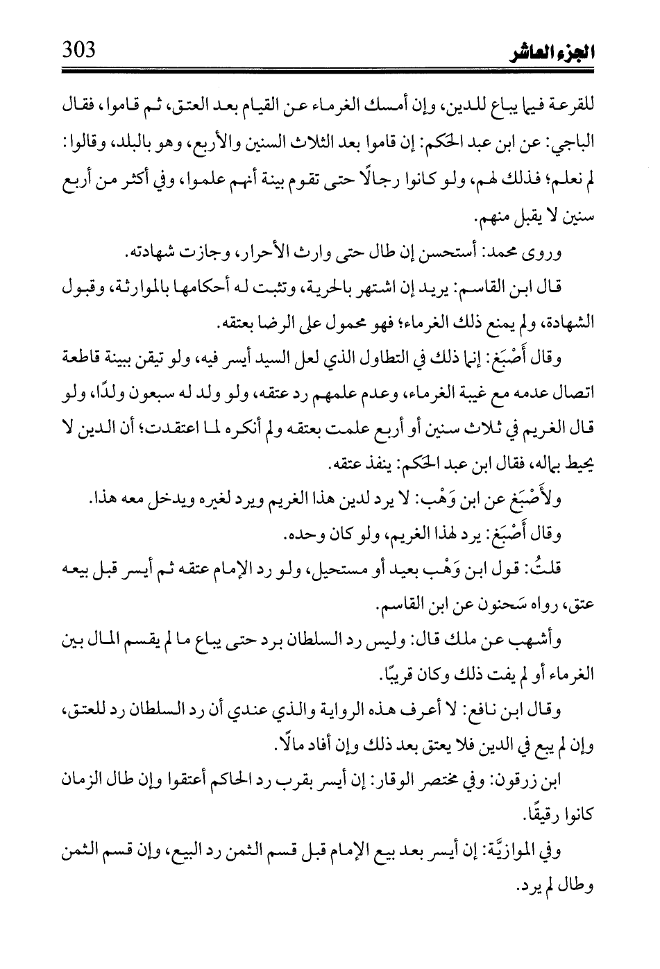 وقال أَصْبَغ: إنما ذلك في التطاول الذي لعل السيد أيسر فيه، ولو تيقن ببينة قاطعة اتصال عدمه مع غيبة الغرماء، وعدم علمهم رد عتقه، ولو ولد له سبعون ولدًا، ولو قال الغريم في ثلاث سنين أو أربع علمت بعتقه ولم أنكره لما اعتقدت؛ أن الدين لا يحيط بماله، فقال ابن عبد الحَكم: ينفذ عتقه.