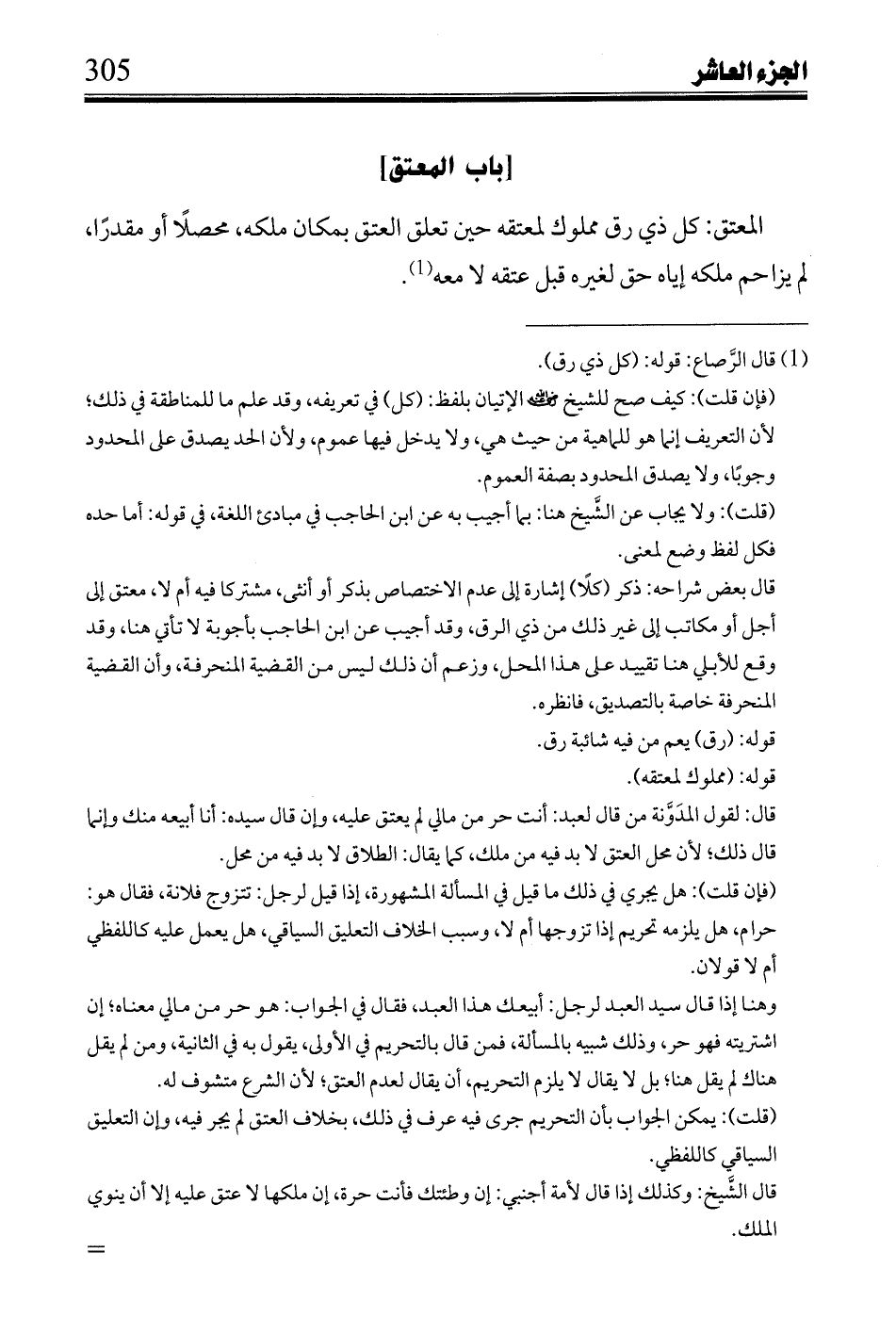 المعتق: كل ذي رق مملوك لمعتقه حين تعلق بمكان ملكه، محصلًا أو مقدرًا، لم يزاحم ملكه إياه حق لغيره قبل عتقه لا معه.