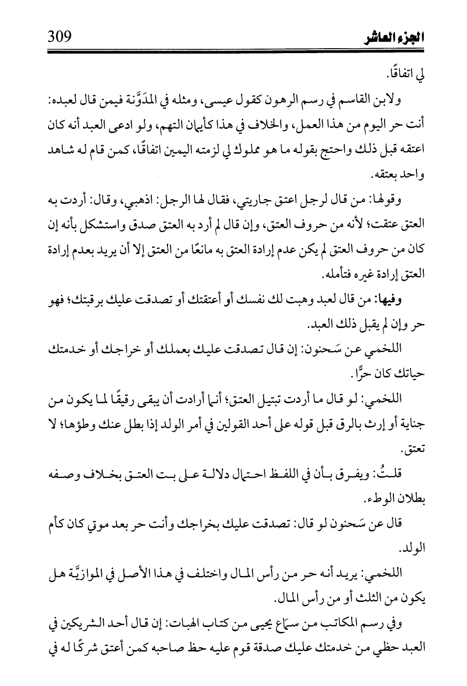 اللخمي عن سَحنون: إن قال تصدقت عليك بعملك أو خراجك أو خدمتك حياتك كان حرًّا.