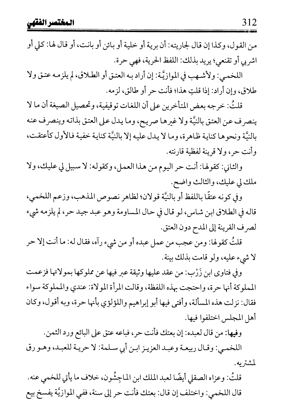 وفي كونه عتقًا باللفظ أو بالنيَّة قولان؛ لظاهر نصوص المذهب، وزعم اللخمي، قاله في الطلاق ابن شاس، لو قال في حال المساومة وهو عبد جيد حر، لم يلزمه شيء لصرف القرينة إلى المدح دون العتق.