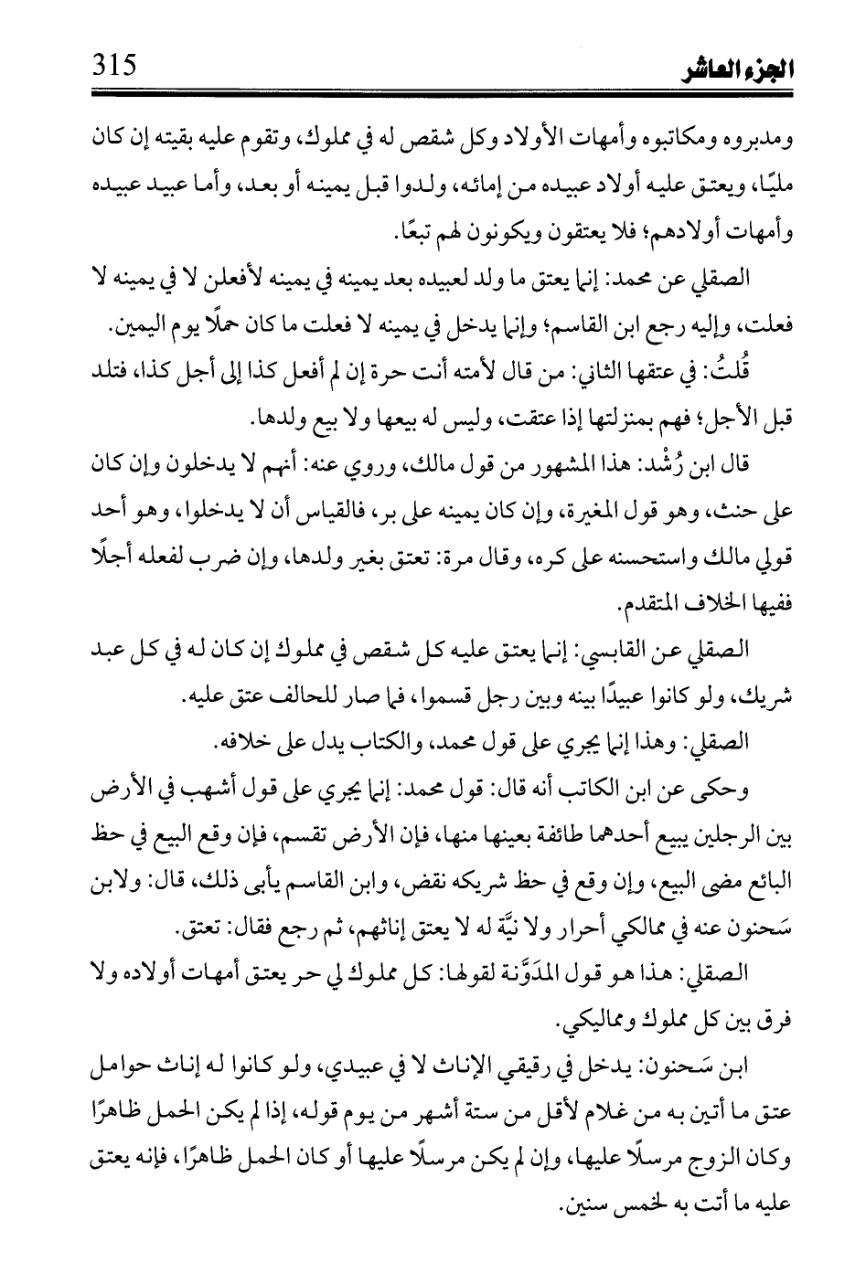ومدبروه ومكاتبوه وأمهات الأولاد وكل شقص له في مملوك، وتقوم عليه بقيته إن كان ملياً، ويعتق عليه أولاد عبيده من إمائه، ولدوا قبل يمينه أو بعد، وأما عبيد عبيده وأمهات أولادهم؛ فلا يعتقون ويكونون لهم تبعاً.