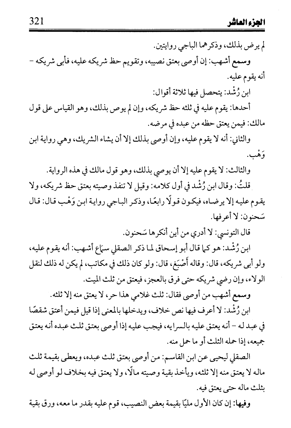 ابن رشد: لا أعرف فيها نص خلاف, ويدخلها بالمعنى إذا قيل فيمن أعتق شقصا فى عبد له - لا أعرف يعتق عليه بالسرايه, فيجب عليه إذا أوصى بعتق ثلث عبده أنه يعتق جمعيه, إذا حمله الثلث وحمل منه.