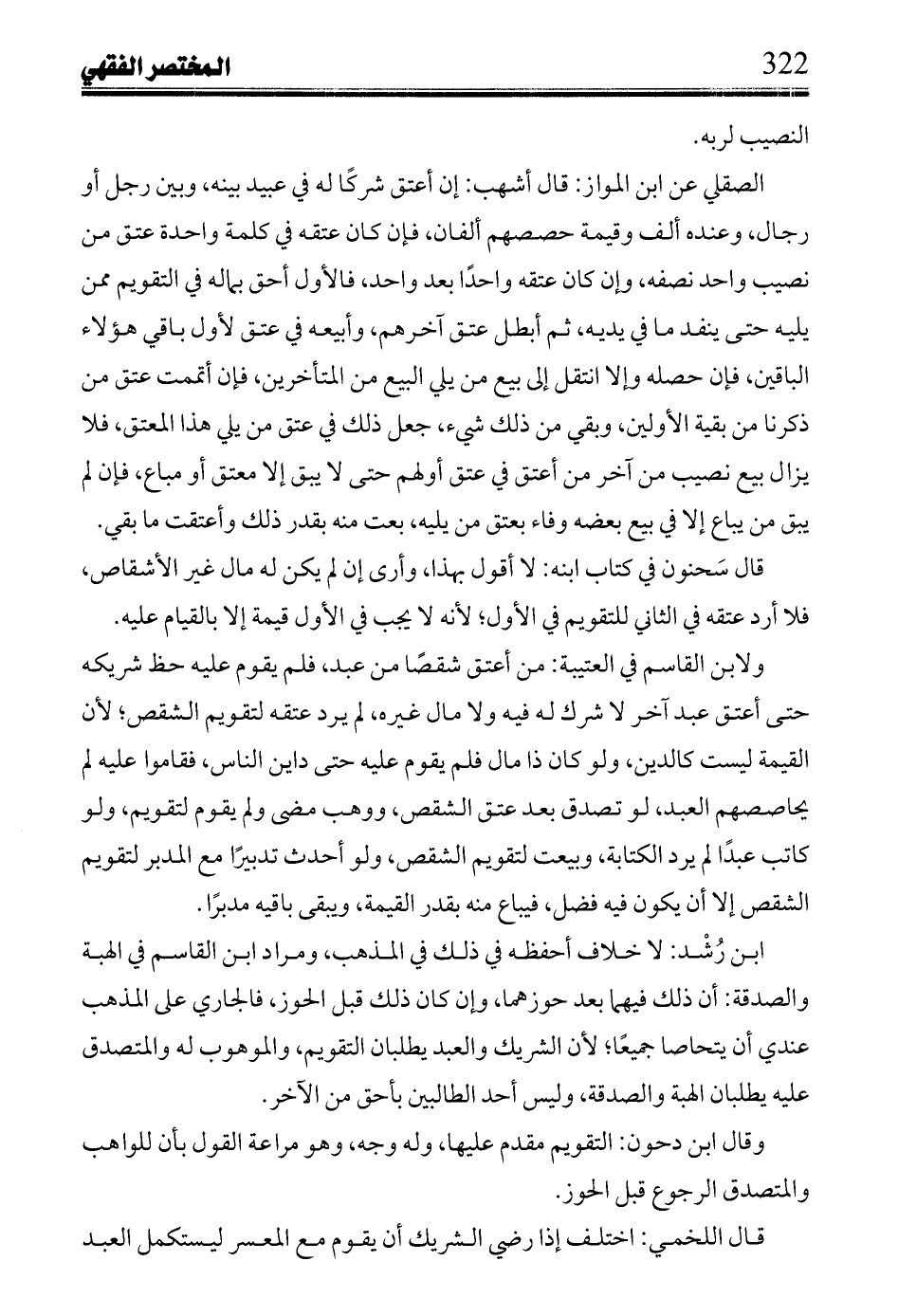 قال سحنون فى كتاب ابنه: لا أقول بهذا, وأرى إن لم يكن له مال غير الأشقاص, فى أرد عتقه فى الثانى للتقويم فى الأول؛ لأنه لا يجب فى الأول قيمة إلا بالقيام عليه.