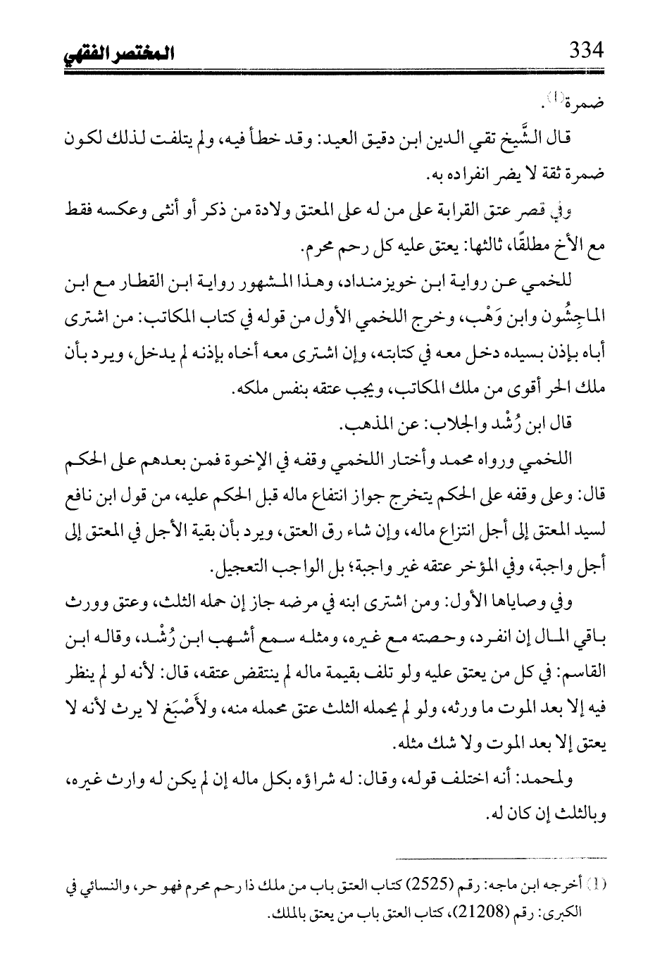 للخمى عن رواية ابن خويز منداد, وهذا المشهور رواية ابن القطار مع ابن الماجشون وابن وهب, وخرج اللخمى الأول من قوله فى كتاب المكاتب: من اشترى أباه بإذن بسيده دخل معه فى كتابته, وإن اشترى معه أخاه بإذنه لم يدخل, ويرد بأن ملك الحر أقوى من ملك المكاتب, ويجب عتقه بنفس ملكه.