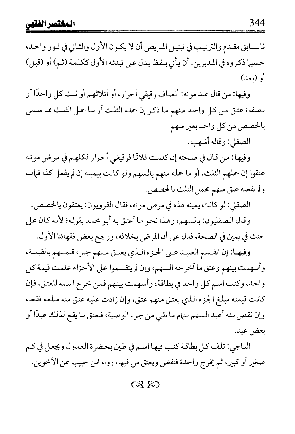 وفيها: إن انقسم العبيد على الجزء الذى يعتق منهم جزء قيمتهم بالقيمة, وأسهمت بينهم وعتق ما أخرجه السهم, وإن لم ينقسموا على الأجزاء علمت قيمة كل واحد, وكتب اسم كل واحد فى بطاقة, وأسهمت بينهم فمن خرج اسمه للعتق, فإن كانت قيمته مبلغ الجزء الذى يعتق منهم عتق, وإن زادت عليه عتق منه مبلغه فقط, وإن نقص منه أعيد السهم لتمام ما بقى من جزء الوصية, فيعتق ما يقع لذلك عبدا أو بعض عبد.