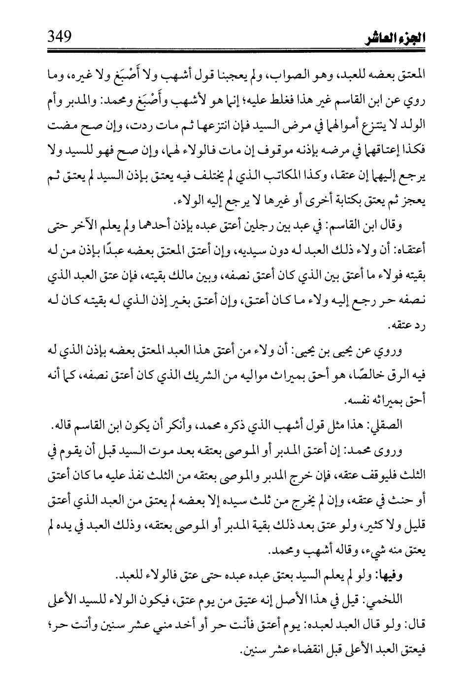 المعتق بعضه للعبد, وهو الصواب, ولم يعجبنا قول أشهب ولا أصبغ ولا غيره, وما روى عن ابن القاسم غير هذا فغلط عليه؛ إنما هو لأشهب وأصبغ ومحمد: والمدبر وأم الولد لا ينتزع أموالها فى مرض السيد فإن انتزاعها ثن مات ردت, وإن صح مضت فهكذا إعتاقهما فى مرضه بإذنه موقوف إن مات فالولاء لهما, وإن صح فهو للسيد ولا يرجع إليهما إن عتقا, وكذا المكاتب الذى لم يختلف فيه يعتق بإذن السيد لم يعتق ثم يعجز ثم يعتق بكتابة أخرى أو غيرها لا يرجع إليه الولاء.