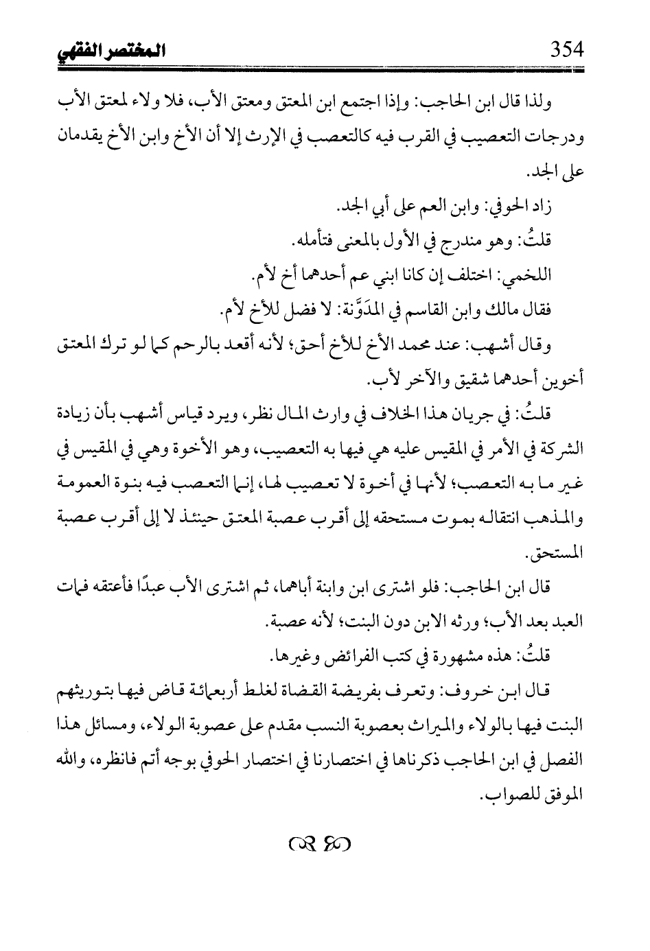 قلت: في جريان هذا الخلاف في وارث المال نظر، ويرد قياس أشهب بأن زيادة الشركة في الأمر في المقيس عليه هي فيها به التعصيب، وهو الأخوة وهي في المقيس في غير ما به التعصب؛ لأنها في أخوة لا تعصيب لها، إنما التعصب فيه بنوة العمومة والمذهب انتقاله بموت مستحقه إلى أقرب عصبة المعتق حينئذ لا إلى أقرب عصبة المستحق.