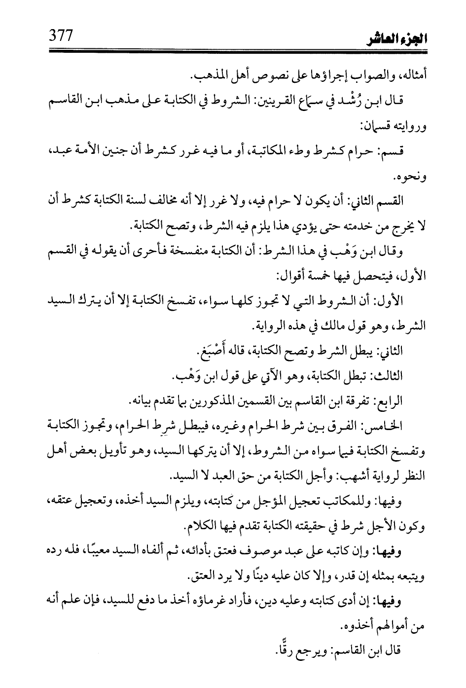 قال ابن رشد في سماع القرينين: الشروط في الكتابة على مهب ابن القاسم وروايته قسمان: