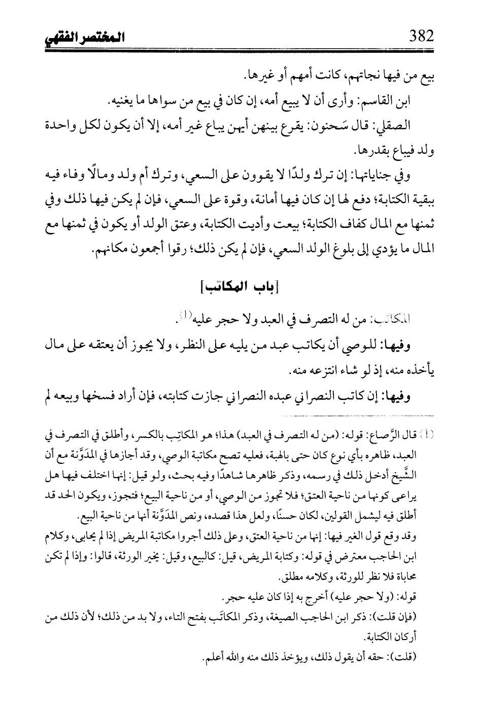 وفيها: للوصي أن يكاتب عبد من يليه على النظر، ولا يجوز أن يعتقه على مال يأخذه منه، إذ لو ساء انتزعه منه.