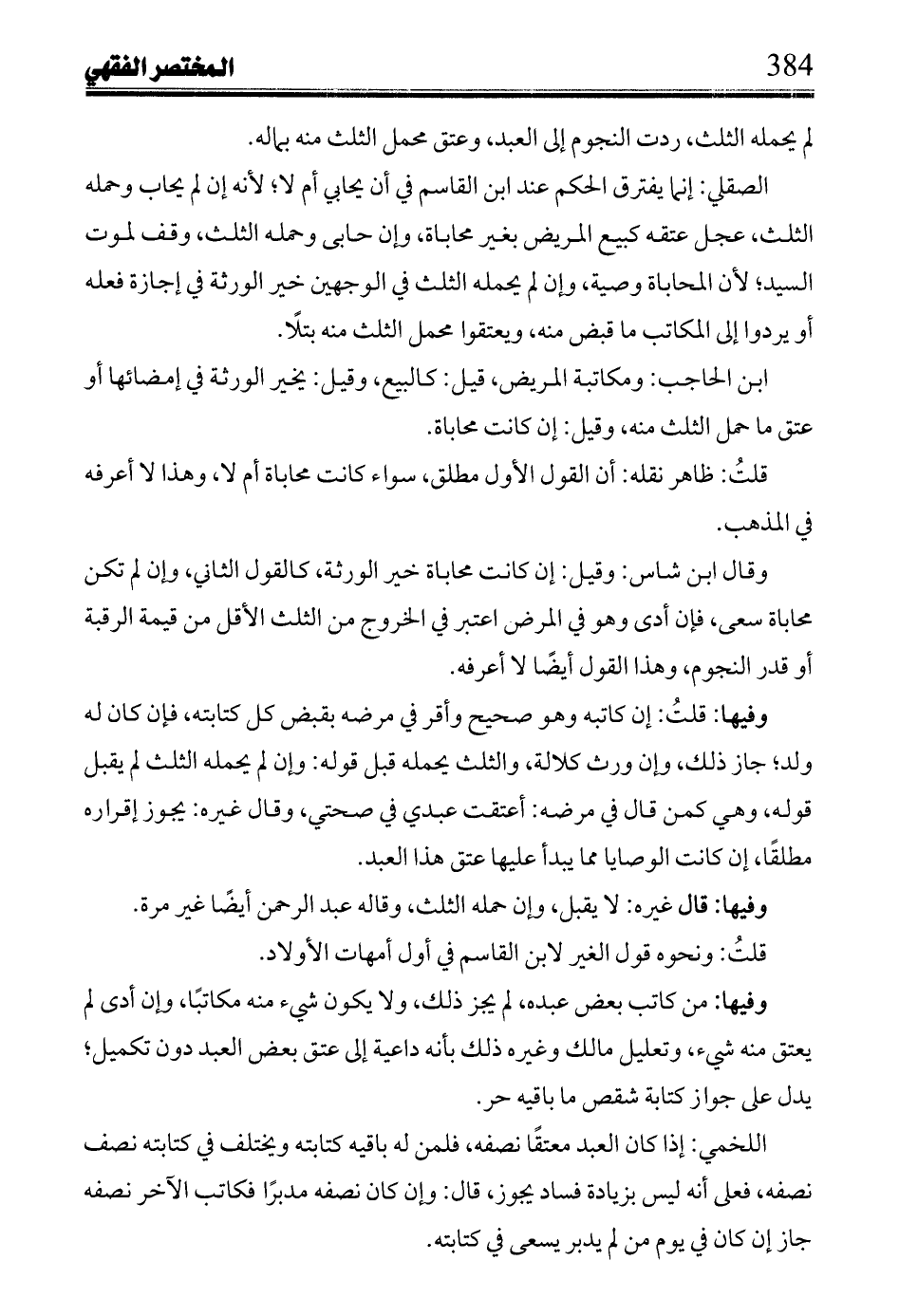 وقال ابن شاس: وقيل: إن كانت محاباة خير الورثة، كالقول الثاني، وإن لم تكن محاباة سعى، فإن أدى وهو في المرض اعتبر في الخروج من الثلث الأقل من قيمة الرقبة أو قدر النجوم، وهذا القول أيضاً لا أعرفه.