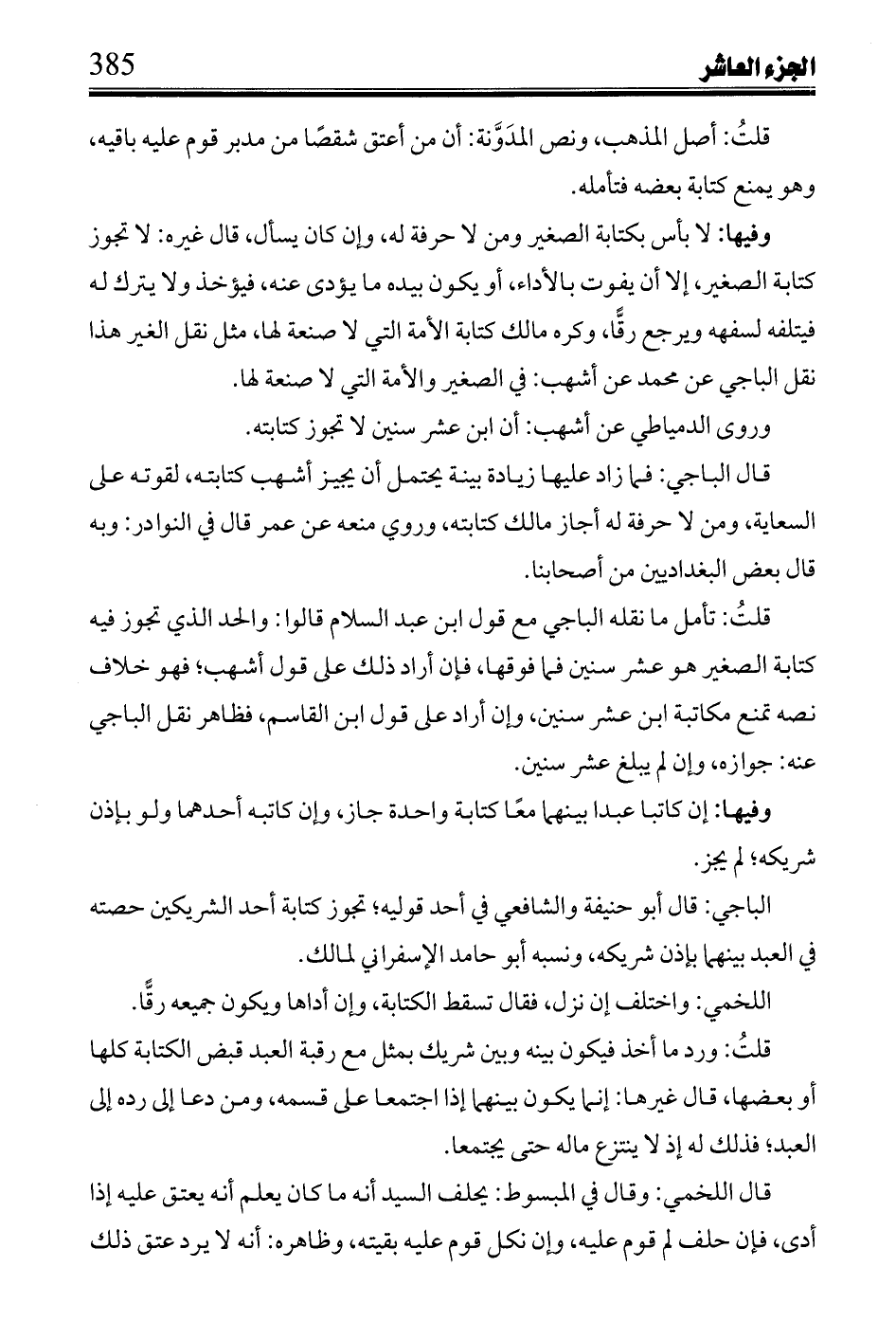قلت: تأمل ما نقله الباجي مع قول ابن عبد السلام قالوا: والحد الذي تجوز فيه كتابة الصغير هو عشر سنين فما فوقها، فإن أراد ذلك على قول أشهب؛ فهو خلاف نصه تمنع مكاتبة ابن عشر سنين، وإن أراد على قول ابن القاسم، فظاهر نقل الباجي عنه: جوازه، وإن لم يبلغ عشر سنين.