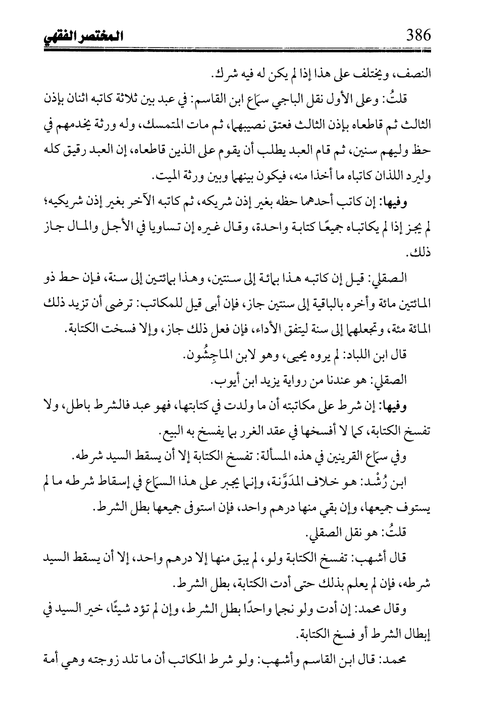 قلت: وعلى الأول نقل الباجي سمَاع ابن القاسم: في عبد بين ثلاثة كاتبه اثنان بإذن الثالث ثم قاطعاه بإذن الثالث فعتق نصيبهما، ثم مات المتمسك، وله ورثه يخدمهم في حظ وليهم سنين، ثم قام العبد يطلب أن يقوم على الذين قاطعاه، إن العبد رقيق كله وليرد اللذان كاتباه ما أخذا منه، فيكون بينهما وبين ورثة الميت.