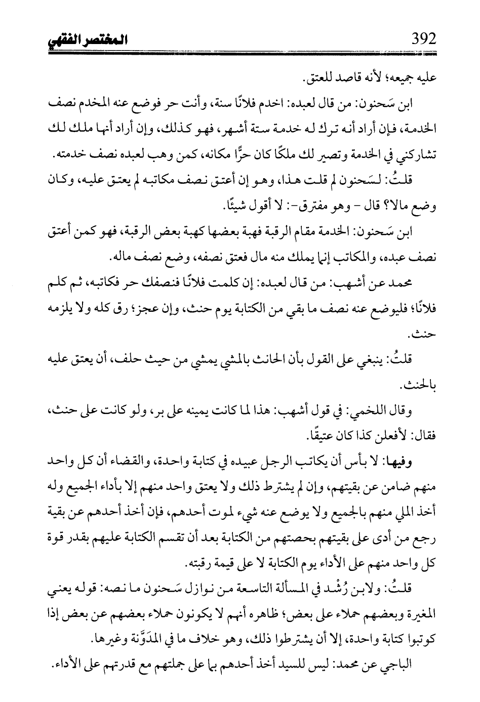 قلتُ: ولابن رُشْد في المسألة التاسعة من نوازل سَحنون ما نصه: قوله يعني المغيرة وبعضهم حملاء على بعض؛ ظاهره أنهم لا يكونون حملاء بعضهم عن بعض إذا كوتبوا كتابة واحدة، إلا أن يشترطوا ذلك، وهو خلاف ما في المدّوَّنة وغيرها.
