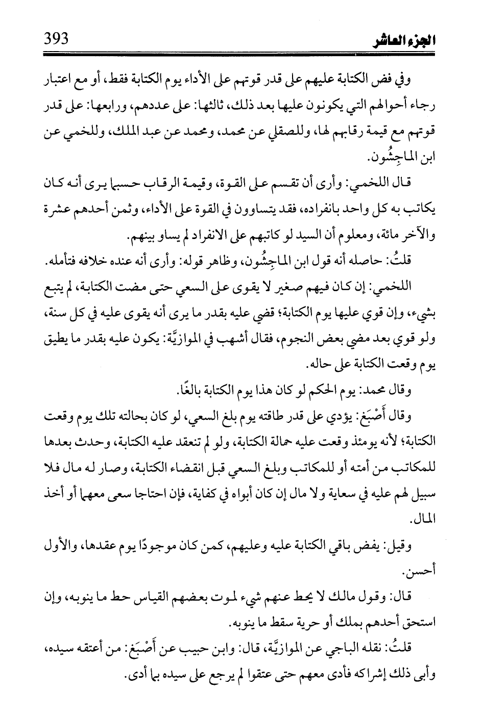 وفي فض الكتابة عليهم على قدر قوتهم على الأداء يوم الكتابة فقط، أو مع اعتبار رجاء أحوالهم التي يكونون عليها بعد ذلك، ثالثها: على عددهم، ورابعها: على قدر قوتهم مع قيمة رقابهم لها، وللصقلي عن محمد، ومحمد عن عبد الملك، وللخمي عن ابن الماجِشُون.