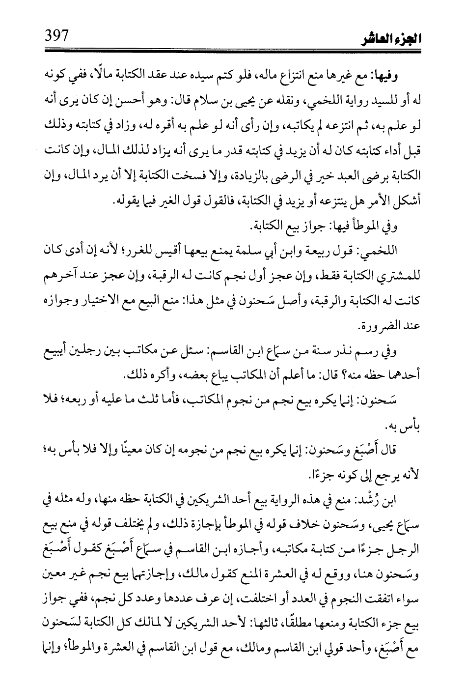ابن رُشْد: منع في هذه الرواية بيع أحد الشريكين في الكتابة حظه منها، وله مثله في سمَاع يحيى، وسَحنون خلاف قوله في الموطأ بإجازة ذلك، ولم يختلف قوله في منع بيع الرجل جزءاً من كتابة مكاتبه، وأجازه ابن القاسم في سمَاع أَصْبَغ كقول أَصْبَغ وسَحنون هنا، ووقع له في العشرة المنع كقول مالك، وإجازتهما بيع نجم غير معين سواء اتفقت النجوم في العدد أو اختلفت، إن عرف عددها وعدد كل نجم، ففي جواز بيع جزء الكتابة ومنعها مطلقاً، ثالثها: لأحد الشريكين لا لمالك كل الكتابة لسَحنون مع أَصْبَغ، وأحد قولي ابن القاسم ومالك، مع قول ابن القاسم في العشرة والموطأ؛ وإنما