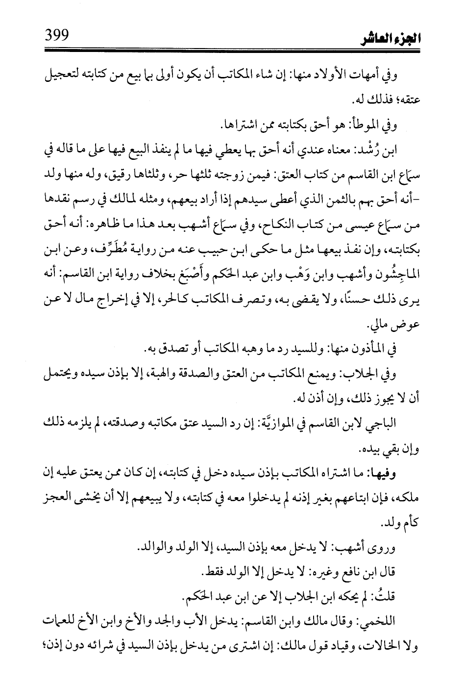 وفيها: ما اشتراه المكاتب بإذن سيده دخل في كتابته، إن كان ممن يعتق عليه إن ملكه، فإن ابتاعهم بغير إذنه لم يدخلوا معه في كتابته، ولا يبيعهم إلا أن يخشى العجز كأم ولد.