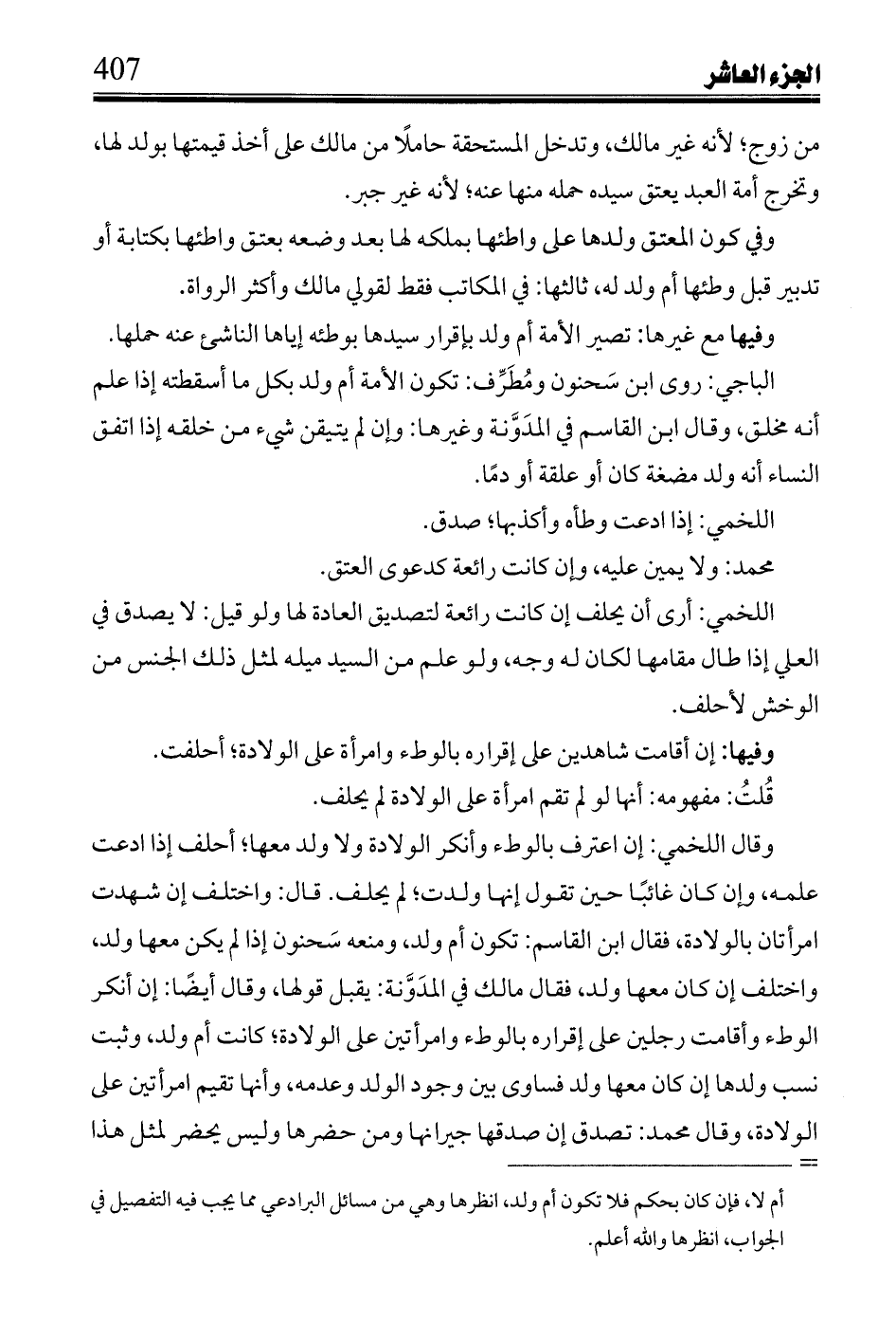 وقال اللحمي: إن اعترف بالوطء وأنكر الولادة ولا ولد معها؛ احلف إذا ادعت علمه، وإن كان غائباً حين تقول أنها ولدت؛ لم يحلف. قال: واختلف أن شهدت امرأتان بالولادة، فقال ابن القاسم: تكون أم ولد، ومنعه سحنون إذا لم يكن معها ولد، واختلف أن كان معها ولد، فقال مالك في المدونة: يقبل قولها، وقال أيضا: أن أنكر الوطء وأقامت رجلين على إقراره بالوطء وامرأتين على الولادة؛ كانت أم ولد، وثبت نسب ولدها إن كان معها ولد فساوى بين وجود الولد وعدمه، وإنها تقيم امرأتين على الولادة، وقال محمد: تصدق أن صدقها جيرانها ومن حضرها وليس يحضر لمثل هذا