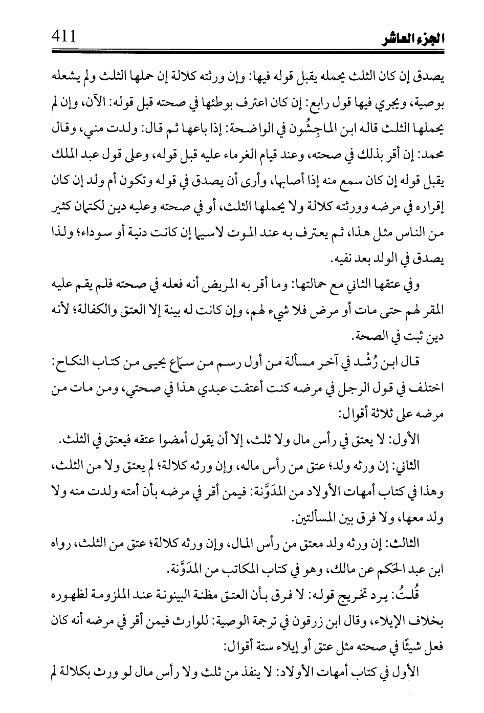 قال ابن رُشْد في أخر مسالة في أول رسم من سماع يحي من كتاب النكاح: اختلف في قول الرجل في مرضه كنت أعتقت عبدي هذا في صحتي، ومن مات من مرضه على ثلاثة أقوال: