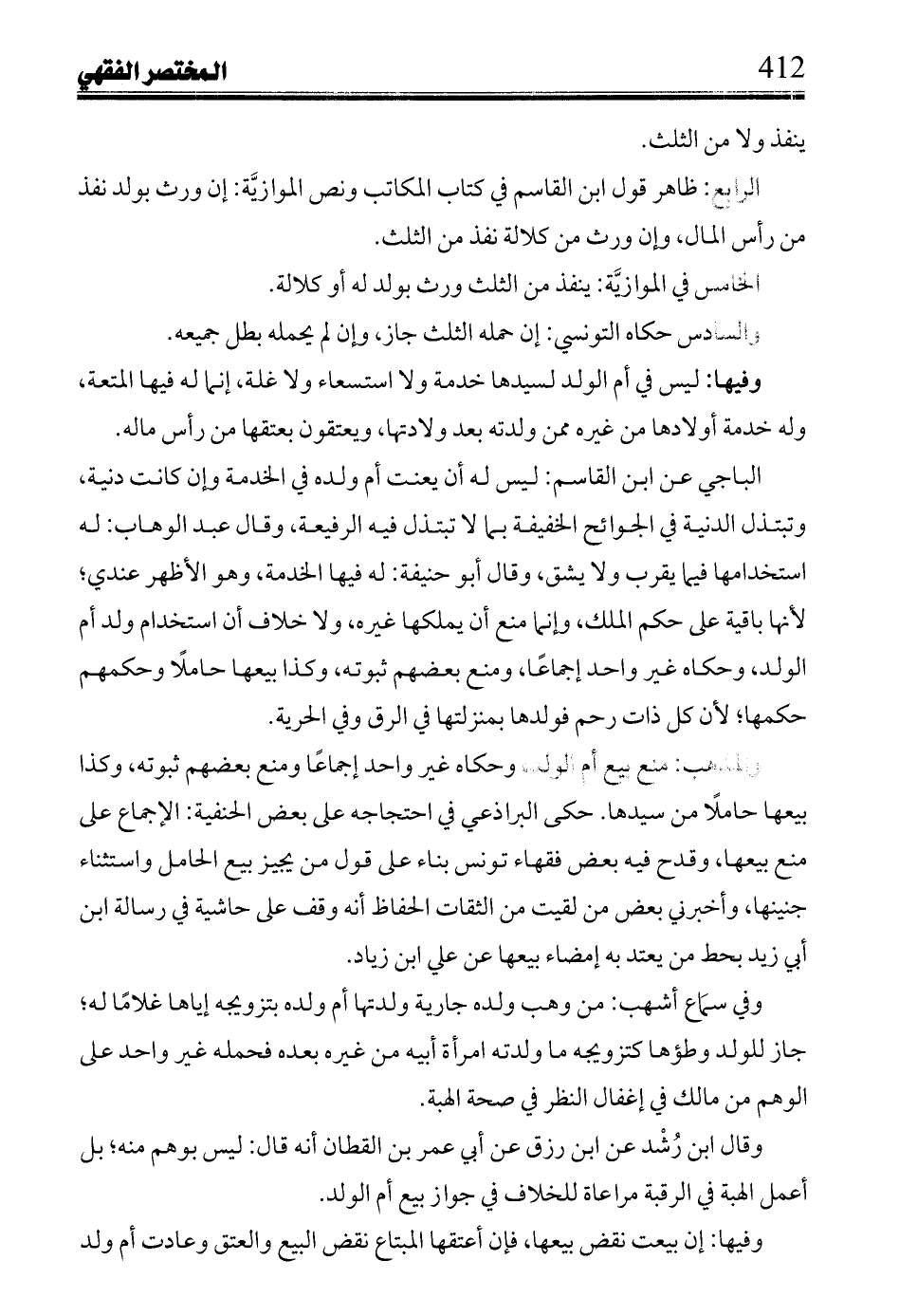 ****** ******* ******* وحكاه غير واحد إجماعا ومنع بعضهم ثبوته، وكذا بيعها حاملاً من سيدها. حكى البراذعي في احتجاجه على بعض الحنفية: الإجماع على منع بيعها، وقدح فيه بعض فقهاء تونس بناء على قول من يجيز بيع الحامل واستثناء جنينها، واخبرني بعض من لقيت من الثقات الحفاظ أنه وقف على حاشية في رسالة ابن أبى زيد بحط من يعتد به إمضاء بيعها عن علي ابن زياد.