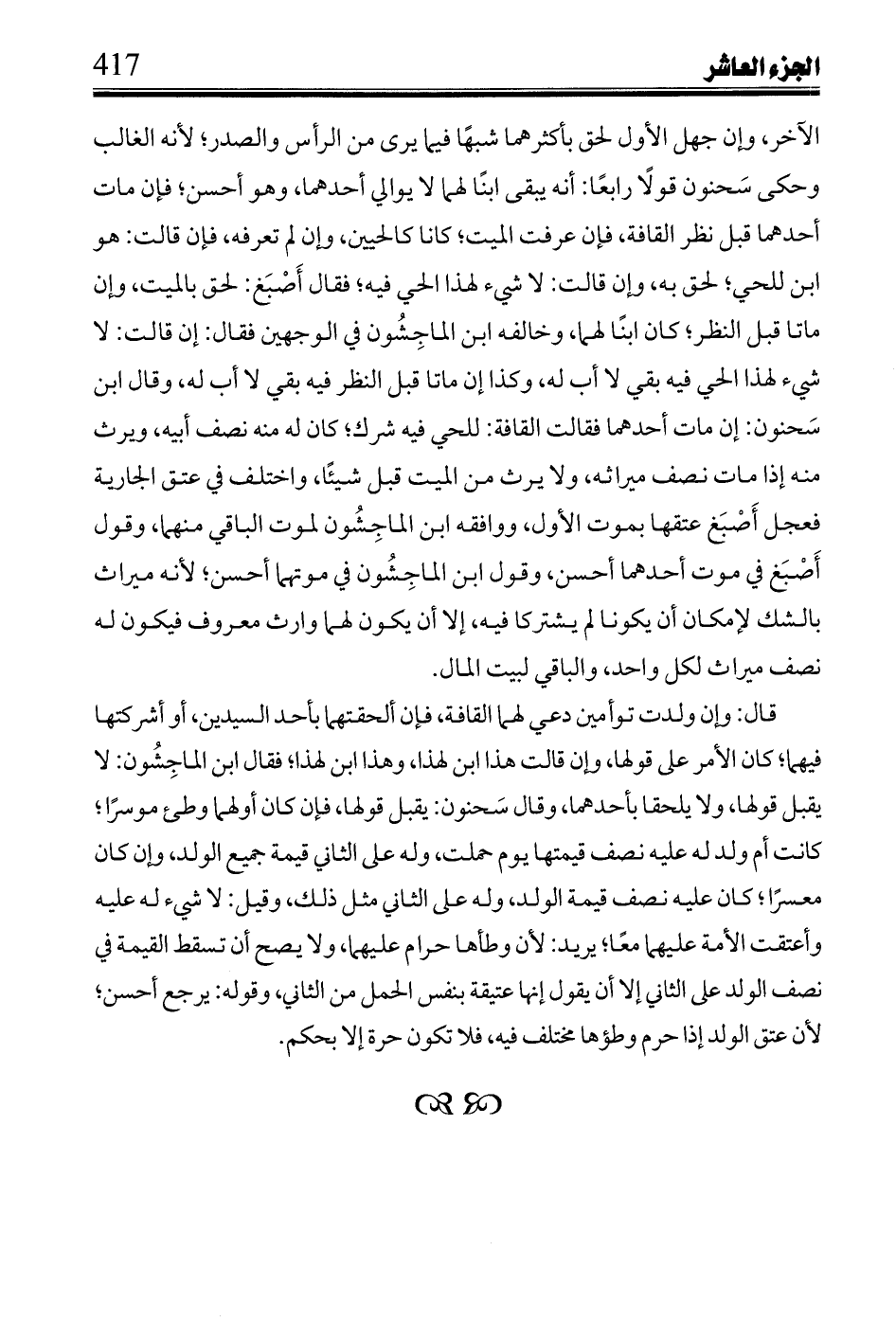 الآخر، وإن جهل الأول لحق بأكثرهما شبهاً فيما يرى من الرأس والصدر؛ لأنه الغالب وحكى سحنون قولاً رابعاً: أنه يبقى ابناً لهما لا يوالي احدهما، وهو أحسن؛ فإن مات احدهما قبل نظر القافة، فإن عرفت الميت؛ كانا كالحيين، وإن لم تعرفه، فإن قالت: هو ابن للحي؛ لحق به، وإن قالت: لا شيء لهذا الحي فيه؛ فقال أَصْبَغ: لحق بالميت، وإن ماتا قب النظر؛ كان ابناً لهما، وخالفه ابن الماجشون في الوجهين فقال: إن قالت: لا شيء لهذا الحي فيه بقى لا أب له، وكذا إن ماتا قبل النظر فيه بقى لا أب له، وقال ابن يحنون: إن مات احدهما فقالت القافة: للحي فيه شرك؛ كان له منه نصف أبيه، ويرث منه إذا مات نصف ميراثه، ولا يرث من الميت قبل شيئاً، واختلف في عتق الجارية فعجل أَصْبَغ عتقها بموت الأول، ووافقه ابن الماجشون لموت الباقي منهما، وقول أَصْبَغ في موت احدهما أحسن، وقول ابن الماجشون في موتهما أحسن؛ لأنه ميراث بالشك لإمكان أن يكونا لم يشتركا فيه، إلا أن يكون لهما وارث معروف فيكون له نصف ميراث لكل واحد، والباقي لبيت المال.