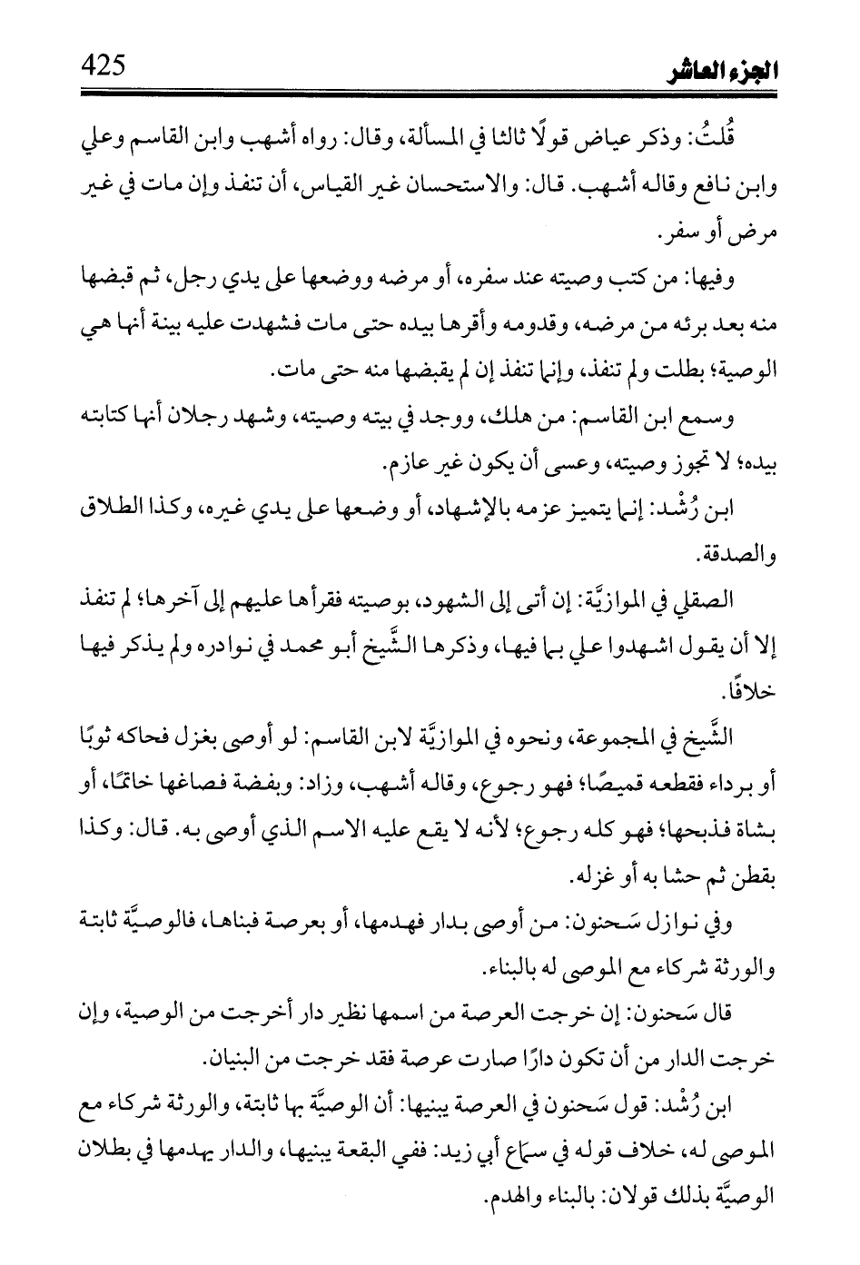 ابن رشد: قول سحنون في العرصة يبينها: أن الوصية بها ثابتة, والورثة شركاء مع الموصى له, خلاف قوله في سماع أبي زيد: ففي البقعة يبينها, والدار يهدمها في بطلان الوصية بذلك قولان: بالبناء والهدم.