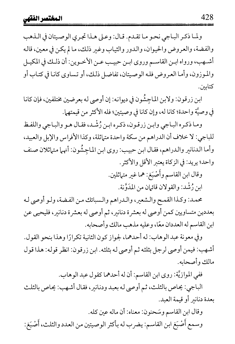ولما ذكر الباجي نحو ما تقدم. قال: وعلى هذا تجري الوصيتان في الذهب والفضة, والعروض والحيوان, والدور والثياب وغير ذلك, ما لم يكن في معين, قاله أشهب, ورواه ابن القاسم وروى ابن حبيب عن الأخوين: أن ذلك في المكيل والموزون, وأما العروض فله الوصيتان, تفاضل ذلك, أو تساوى كانا في كتاب أو كتابين.