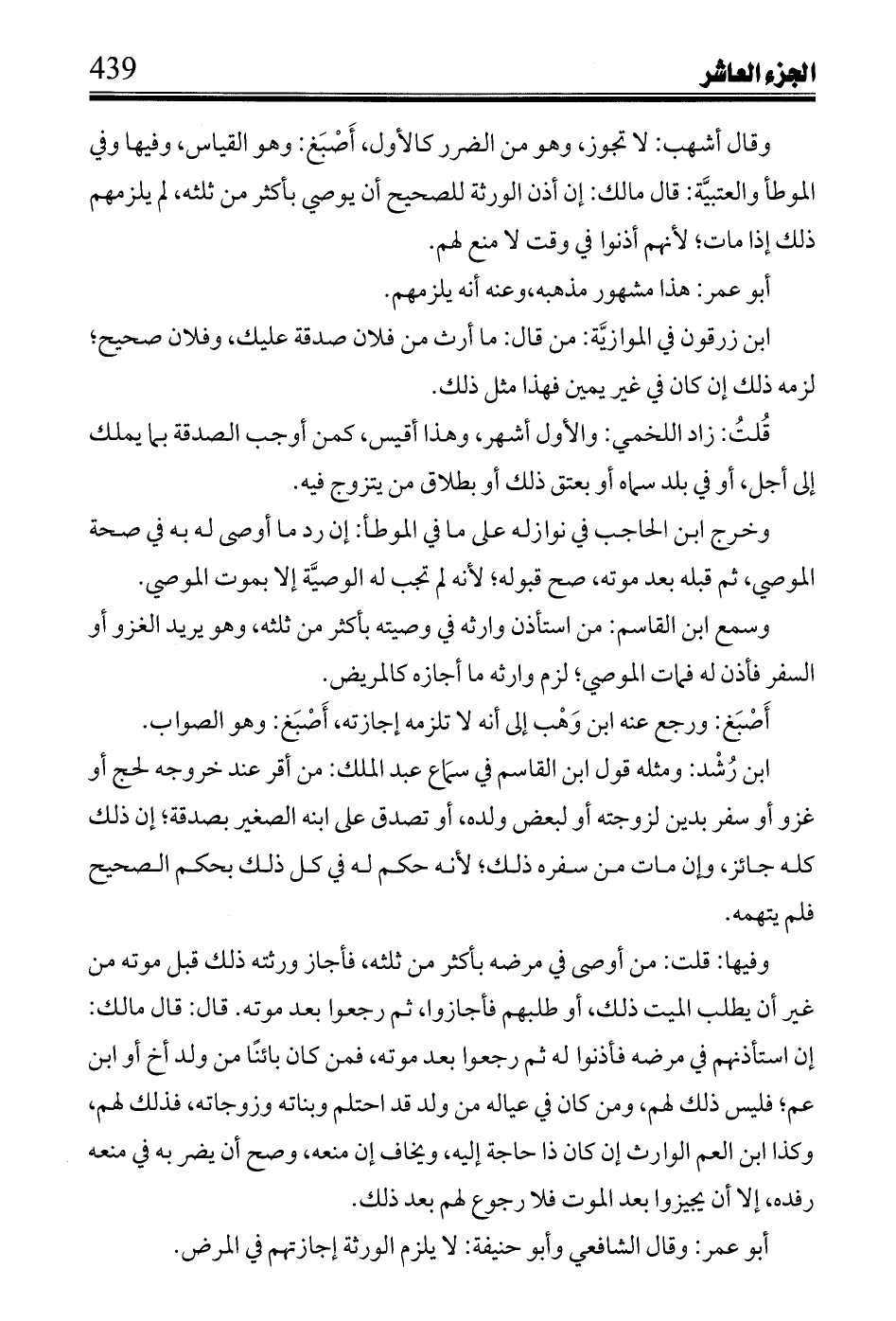 وقال أشهب: لا تجوز، وهو من الضرر كالأول، أَصْبَغ: وهو القياس، وفيها وفي الموطأ والعتبيَّة: قال مالك: إن أذن الورثة للصحيح أن يوصي بأكثر من ثلثه، لم يلزمهم ذلك إذا مات؛ لأنهم أذنوا في وقت لا منع لهم.