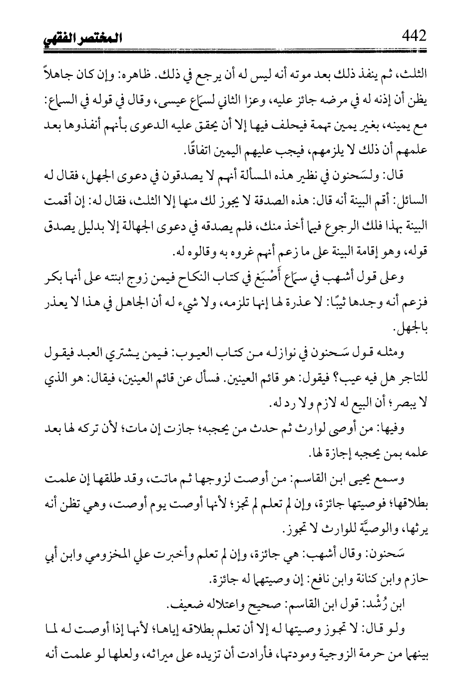 قال: ولسَحنون في نظير هذه المسألة أنهم لا يصدقون في دعوى الجهل، فقال له السائل: أقم البينة أنه قال: هذه الصدقة لا يجوز لك منها إلا الثلث، فقال له: إن أقمت البينة بهذا فلك الرجوع فيما أخذ منك، فلم يصدقه في دعوى الجهالة إلا بدليل يصدق قوله، وهو إقامة البينة على ما زعم أنهم غروه به وقالوه له.