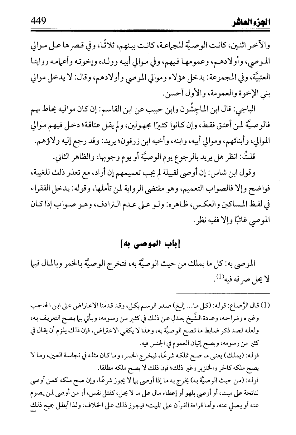 والآخر اثنين، كانت الوصية للجماعة، كانت بينهم، ثلاثاً، وفي قصرها على موالي الموصي، وأولادهم، وعمومها فيهم، وفي موالي أبيه وولده وإخوته وأعمامه روايتا العتبيَّة، وفي المجموعة: يدخل هؤلاء وموالي الموصي وأولادهم، وقال: لا يدخل موالي بني الأخوة والعمومة، والأول أحسن.