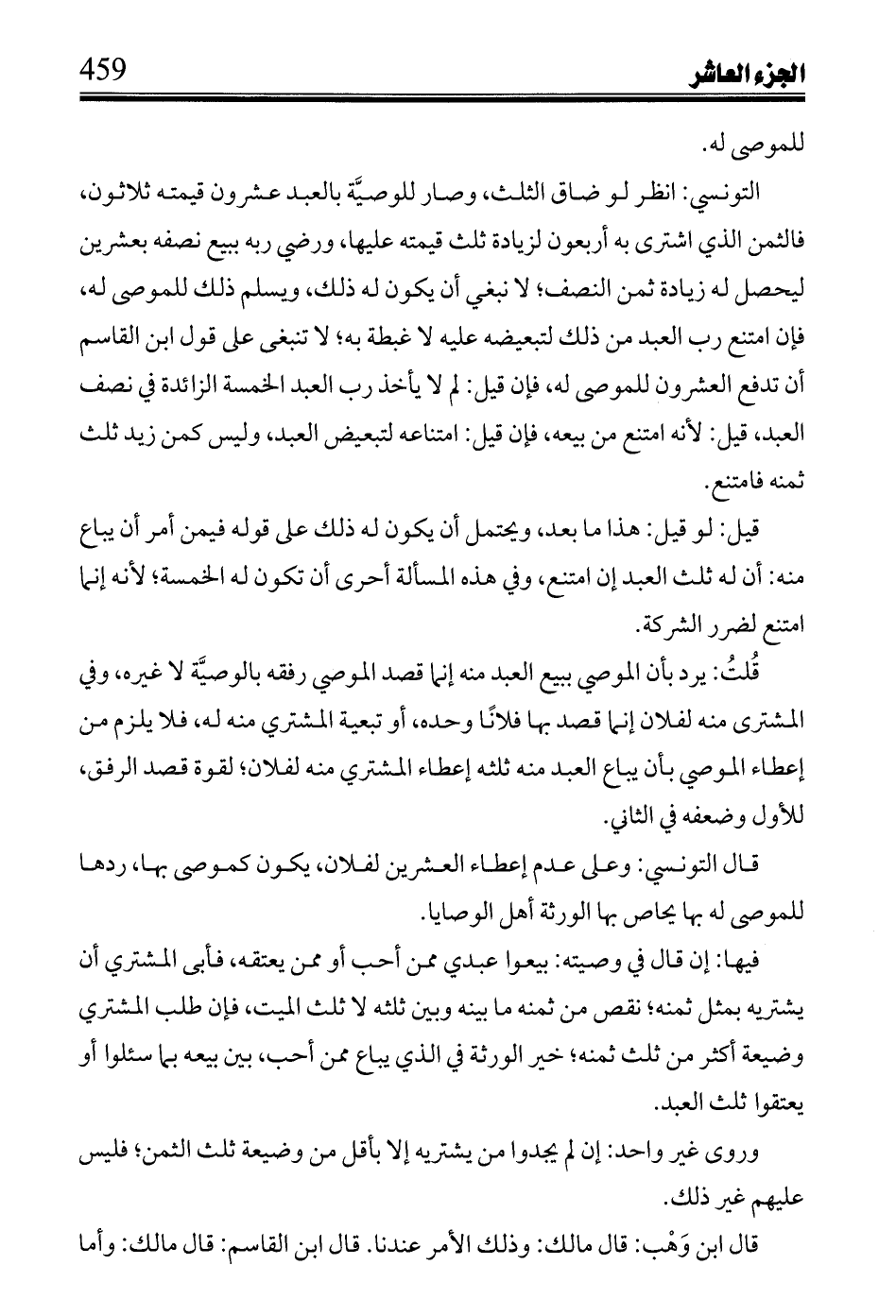 التونسي: انظر لو ضاق الثلث، وصار للوصية بالعبد عشرون قيمته ثلاثون، فالثمن الذي اشترى به أربعون لزيادة ثلث قيمته عليها، ورضي ربه ببيع نصفه بعشرين ليحصل له زيادة ثمن النصف؛ لا نبغي أن يكون له ذلك، ويسلم ذلك للموصي له، فإن امتنع رب العبد من ذلك لتبعيضه عليه لا غبطة به؛ لا تنبغي على قول ابن القاسم أن تدفع العشرون للموصي له، فإن قيل: لم لا يأخذ رب العبد الخمسة الزائدة في نصف العبد، قيل: لأنه امتنع من بيعه، فإن قيل: امتناعه لتبعيض العبد، وليس كمن زيد ثلث ثمنه فامتنع.