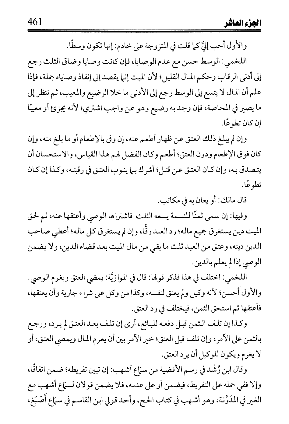 اللخمي: الوسط حسن مع عدم الوصايا، فإن كانت وصايا وضاق الثلث رجع إلى أدنى الرقاب وحكم المال القليل؛ لأن الميت إنما يقصد إلى أنفاذ وصايا جملة، فإذا علم أن المال لا يتسع إلى الوسط رجع إلى الأدنى ما خلا الرضيع والمعيب، ثم ننظر إلى ما يصير في المحاصة، فإن وجد به رضيع وهو عن واجب اشتري؛ لأنه يجزئ أو معيباً إن كان تطوعاً.