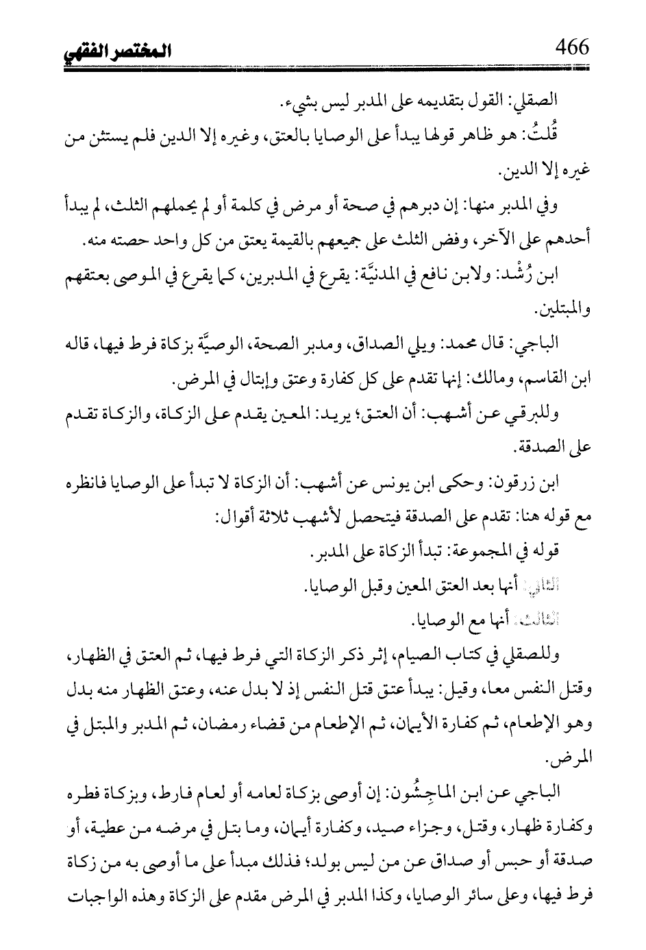 الباجي عن ابن الماجِشُون: إن أوصى بزكاة لعامه أو لعام فارط، وبركاة فطره وكفارة ظهار، وقتل، وجزاء صيد، وكفارة أيمان، وما بتل في مرضه من عطية، أو صدقة أو حبس أو صداق عن من ليس بولد؛ فذلك مبدأ على ما أوصى به في زكاة فرط فيها: وعلى سائر الوصايا، وكذا المدبر في المرض مقدم على الزكاة وهذه الواجبات
