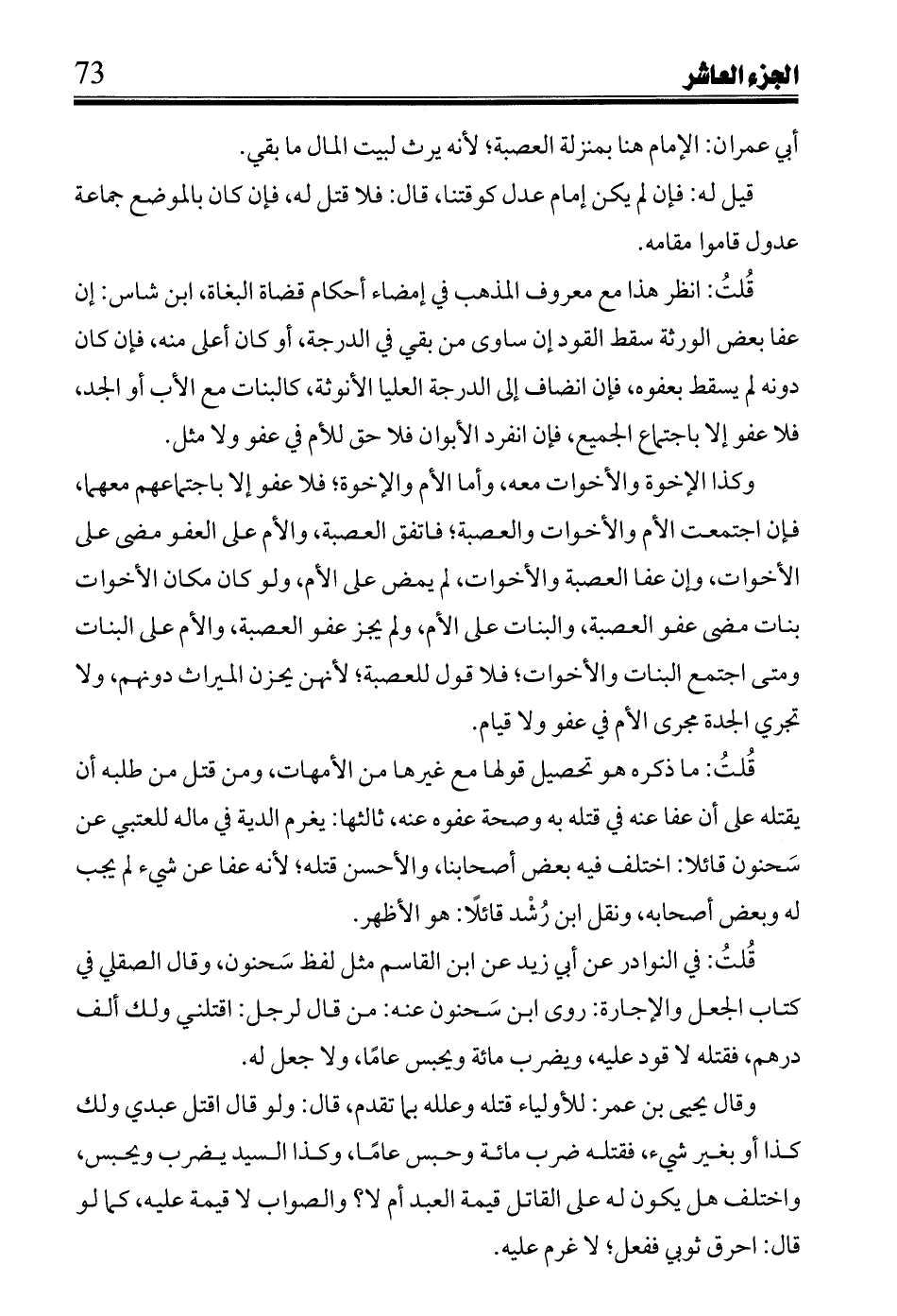قُلتُ: انظر هذا مع معروف المذهب في إمضاء أحكام قضاة البغاة، ابن شاس: إن عفا بعض الورثة سقط القود إن ساوى من بقي في الدرجة، أو كان أعلى منه، فإن كان دونه لم يسقط بعفوه، فإن أنضاف إلى الدرجة العليا الأنوثة، كالبنات مع الأب أوالجد، فلا عفو إلا باجتماع الجميع، فإن انفرد الأبوان فلا حق للأم في عفو ولا مثل.