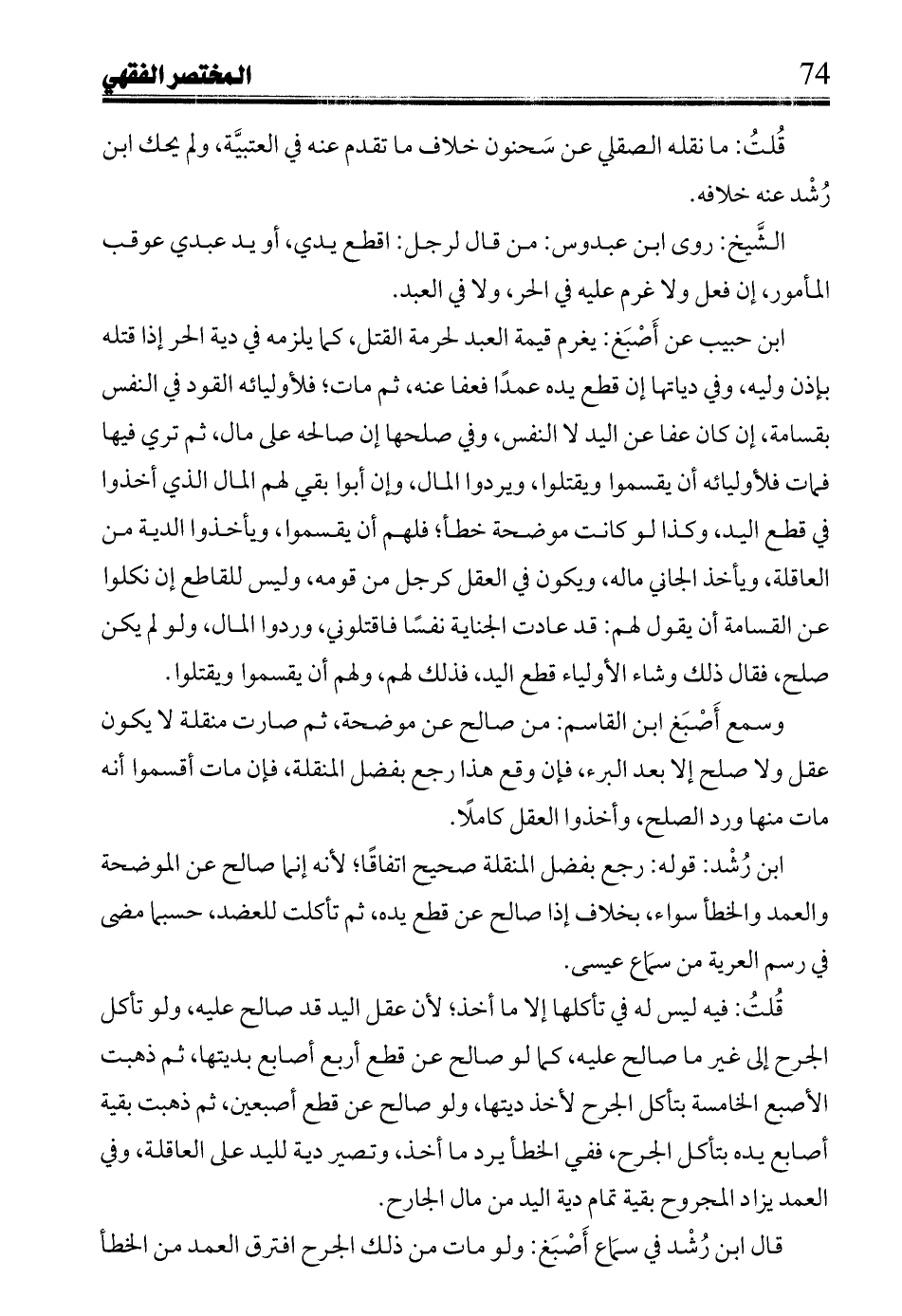 ابن حبيب عن أصبغ: يغرم قيمة العبد لحرمة القتل، كما يلزم في دية الحر إذا قتله بإذن وليه، وفي دياتها إن قطع يده عمدًا فعفا عنه، ثم مات؛ فلأوليائه القود في النفس بقسامة، إن كان عفا عن اليد لا النفس، وفي صلحها إن صالحه على مال، ثم ترى فيها فمات فلأوليائه أن يقسموا ويقتلوا، ويردوا المال، وإن أبوا بقى لهم المال الذي أخذوا في قطع اليد، وكذا لو كانت موضحة خطأ؛ فلهم أن يقسموا، ويأخذوا الدية من العاقلة، ويأخذ الجاني ماله، ويكون في العقل كرجل من قومه، وليس للقاطع إن نكلوا عن القسامة أن يقول لهم: قد عادت الجناية نفسًا فاقتلوني، وردا المال، ولو لم يكن صلح، فقال ذلك وشاء الأولياء قطع اليد، فذلك لهم، ولهم أن يقسموا ويقتلوا.