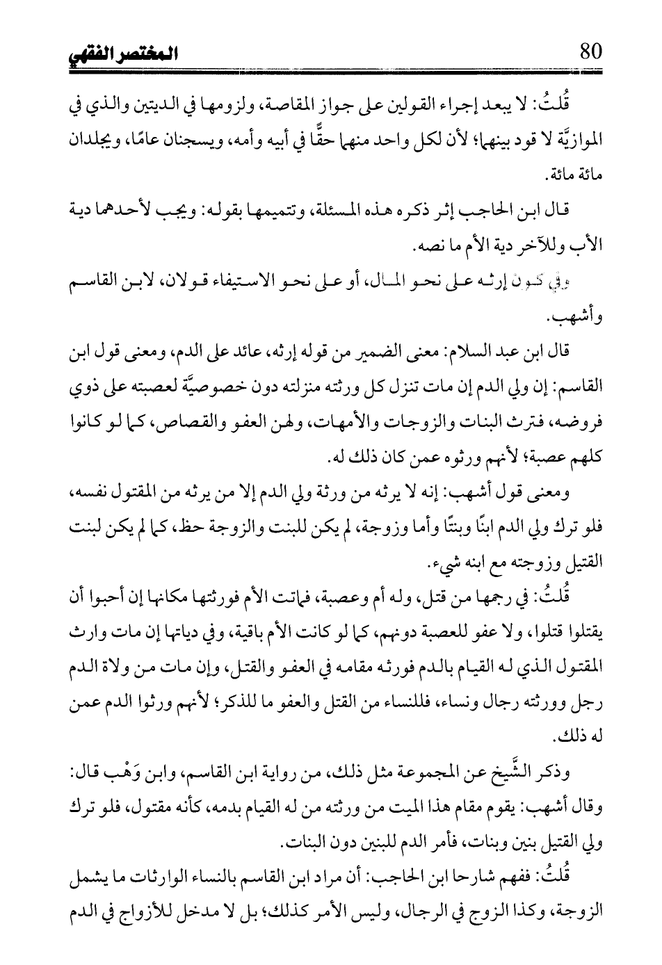 قال ابن عبد السلام: معنى الضمير من قوله إرثه، عائد على الدم، ومعنى قول ابن القاسم: إن ولي الدم إن مات تنزل كل ورثته منزلته دون خصوصية لعصبته على زوي فروضه، فترث البنات والزوجات والأمهات، ولهن العفو والقصاص، كما لو كانوا كلهم عصبة؛ لأنهم ورثوه عمن كان ذلك له.