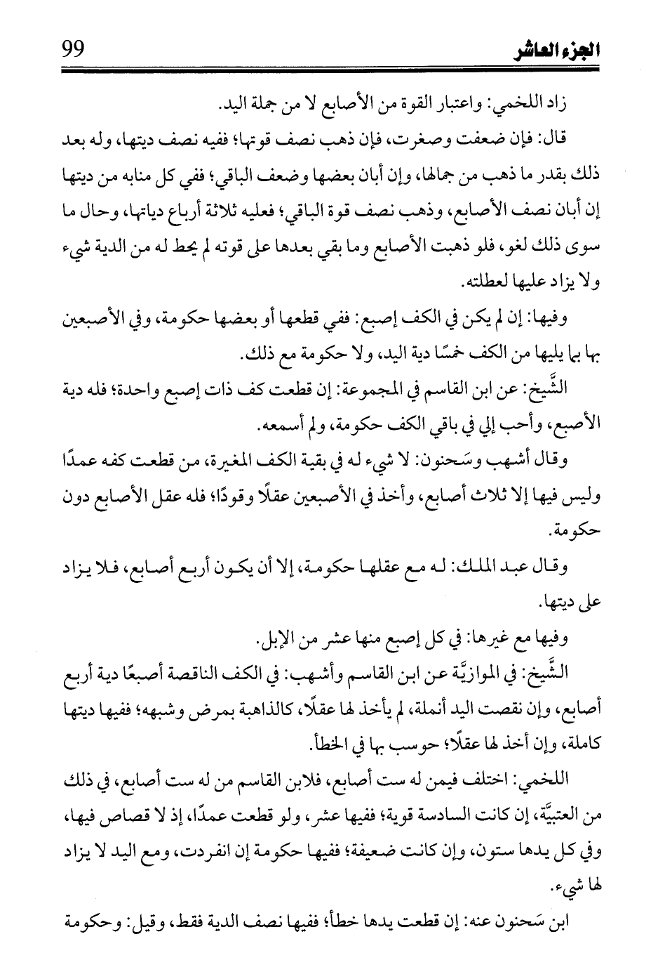 الشيخ: في الموازنة عن ابن القاسم وأشهب: في الكف الناقصة أصبعاً دية أربع أصابع، وإن نقصت اليد أنملة، لم يأخذ لها عقلاً، كالذاهبة بمرض وشبهه؛ ففيها ديتها كاملة، وإن أخذ عقلاً؛ حوسب بها في الخطأ.