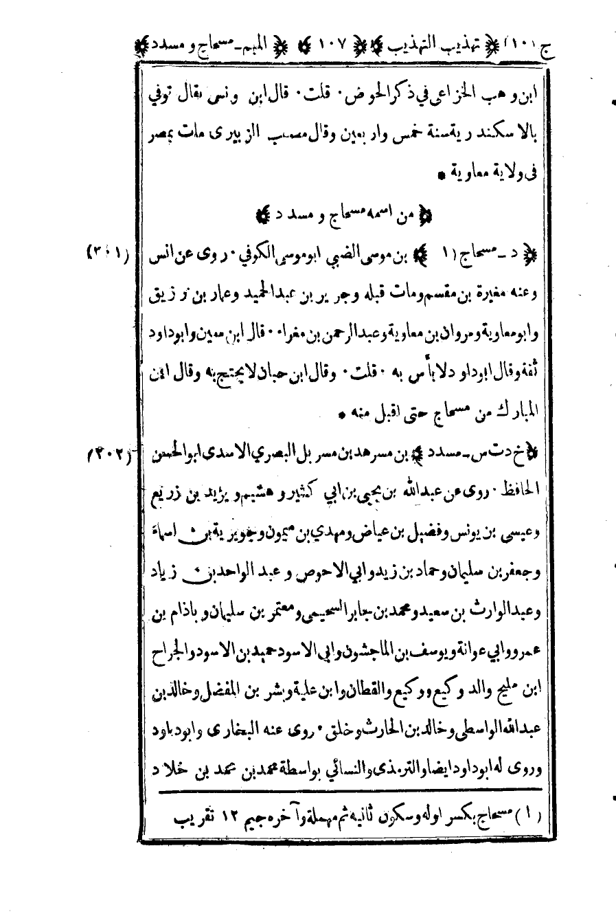 202 – "خ د ت س – مسدد" بن مسرهد بن مسربل البصري الأسدي أبو الحسن الحافظ روى عن عبد الله بن يحيى بن أبي كثير وهشيم ويزيد بن زريع وعيسى بن يونس وفضيل بن عياض ومهدي بن ميمون وجويرية بن أسماء وجعفر بن سليمان وحماد بن زيد وأبي الأحوص وعبد الوااحد بن زياد وعبد الوارث بن سعيد ومحمد بن جابر السحيمي ومعتمر بن سليمان وباذام بن عمرو وأبي عوانة ويوسف بن الماجشون وأبي الأسود حميد بن الأسود والجراح بن مليح والد وكيع ووكيع والقطان وابن عليه وبشر بن المفضل وخالد بن عبد الله الواسطي وخالد بن الحارث وخلق روى عنه البخاري وأبو داود وروى له أبو داود أيضا والترمذي والنسائي بواسطة محمد بن محمد بن خلاد