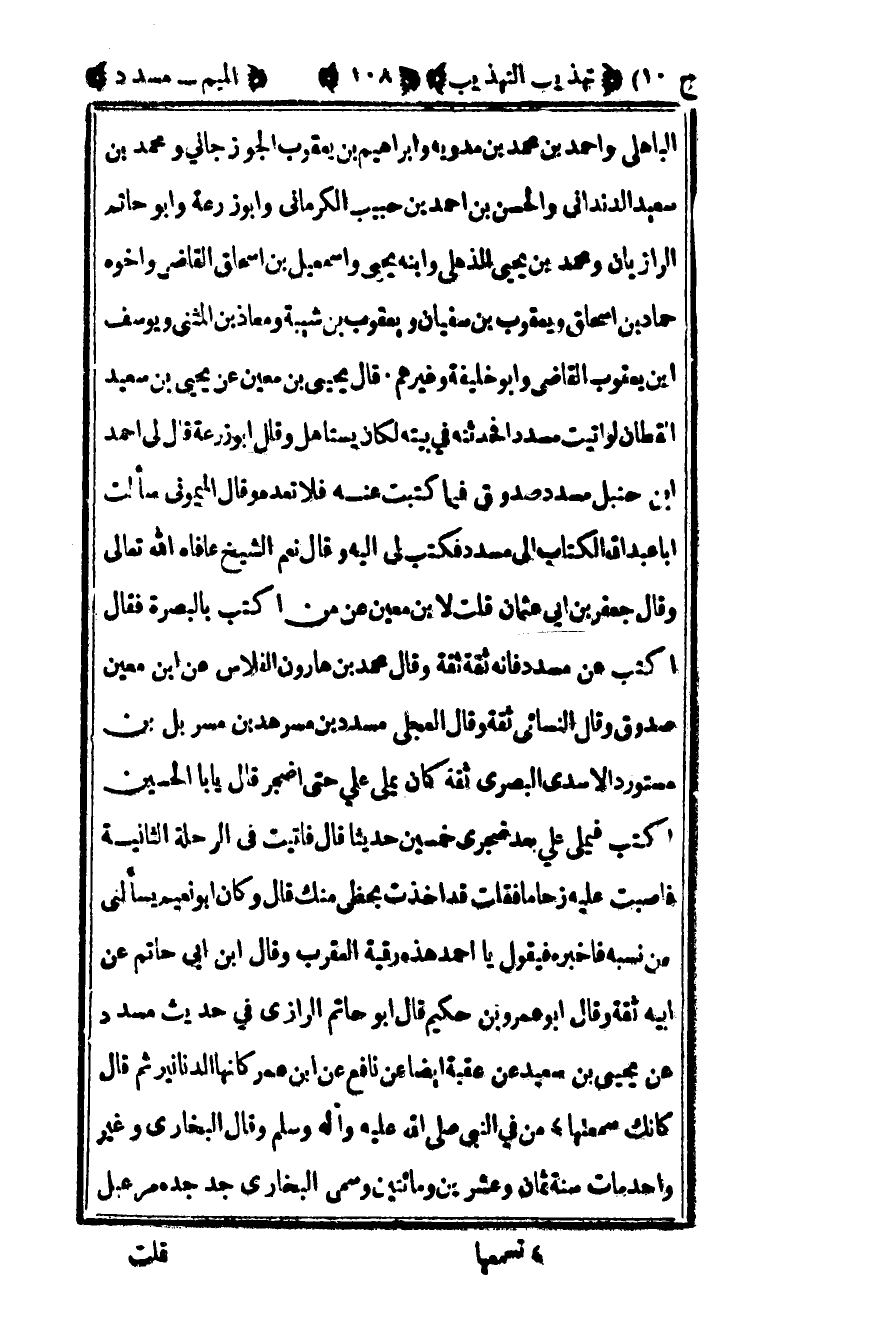 الباهلي وأحمد بن محمد بن مدويه وإبراهيم بن يعقوب الجوزجاني ومحمد بن سعيد الدنداني والحسن بن أحمد بن حبيب الكرماني وأبو زرعة وأبو حاتم الرازيان ومحمد بن يحيى الذهلي وابنه يحيى وإسماعيل بن إسحاق القاضي وأخوه حماد بن إسحاق ويعقوب بن سفيان ويعقوب بن شيبة ومعاذ بن المثنى ويوسف بن يعقوب القاضي وأبو خليفة وغيرهم قال يحيى بن معين عن يحيى بن سعيد القطان لو أتيت مسددا فحدثته في بيته لكان يستاهل وقال أبو زرعة قال لي أحمد بن حنبل مسدد صدوق فيما كتبت عنه فلا تعده وقال الميموني سألت أبا عبد الله الكتاب إلى مسدد فكتبت لي إليه وقال نعم الشيخ عافاه الله تعالى وقال جعفر بن أبي عثمان قلت لابن معين عن من اكتب بالبصرة فقال اكتب عن مسدد فإنه ثقة ثقة وقال محمد بن هارون الفلاس عن بن معين صدوق وقال النسائي ثقة وقال العجلي مسدد بن مسرهد به مسربل بن مستورد الأسدي البصري ثقة كان يملي علي حتى اضجر قال يا أبا الحسين اكتب فيملي علي بعد ضجري خمسين حديثا قال فأتيت في الرحلة الثانية فأصبت عليه زحاما فقلت قد أخذت بحظي منك قال وكان أبو نعيم يسألني من نسبه فأخبره فيقول يا أحمد هذه رقية العقرب وقال بن أبي حاتم عن أبيه ثقة وقال أبو عمرو بن حكيم قال أبو حاتم الرازي في حديث مسدد عن يحيى بن سعيد عن عقبة أيضا عن نافع عن بن عمر كأنها الدنانير ثم قال كأنك سمعتها من في النبي صلى الله عليه وسلم وقال البخاري وغير واحد مات سنة ثمان وعشرين مائتين وسمي البخاري جد جده مرعبل