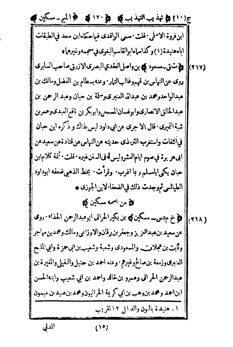 218- "خ م د س – مسكين" بن بكير الحراني أبو عبد الرحمن الحذاء روى عن سعيد بن عبد العزيز وجعفر بن برقان والأوزاعي ومالك ومحمد بن مهاجر وثابت بن عجلان والمسعودي وشعبة وشعيب بن أبي حمزة وأبي المليح العنبري وزمعة بن صالح وغيرهم وعنه أحمد بن حنبل والنفيلي والمغيرة بن عبد الرحمن الحراني وعمرو بن خالد وأحمد بن أبي شعيب وابنه الحسن بن أحمد ومحمد بن وهب بن أبي كريمة الحرانيون ومحمد بن عبيد بن ميمون